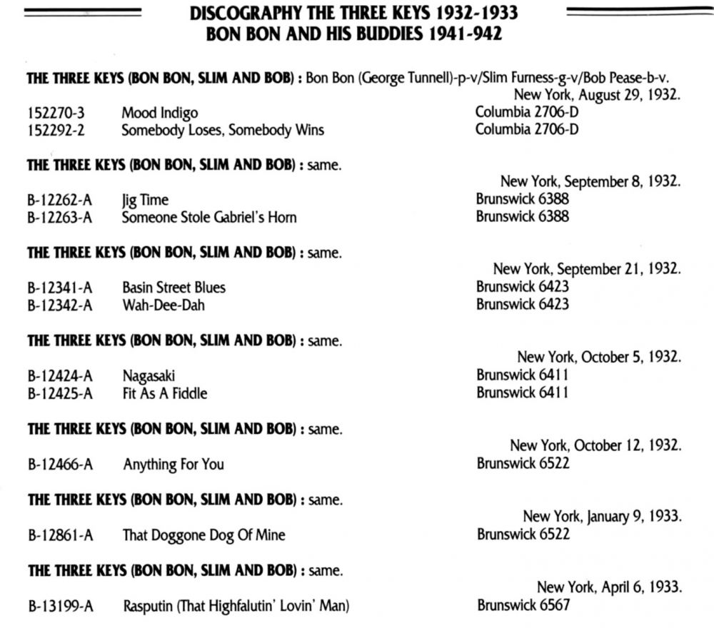 1932 wurde in Pennsylvania auch eine Gruppe namens The Radio Boys of Bob Pease erwähnt, jedoch Vorsicht, der Name "Radio Boys" wurde vielfach benutzt. Gern wurden sie auch einfach "Bon Bon, Slim und Bob" oder anfänglich auch "Three Keys Trio" genannt.