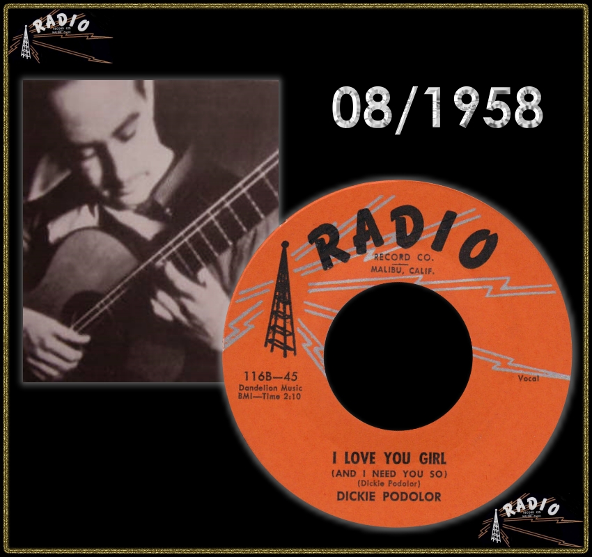 Richard Podolor has had a long and successful career in the music industry, most notably as a guitarist and producer. Podolor was schooled in classical piano, but later switched to classical guitar, becoming a protégé of Vicente Gomez. In 1956 he was signed by Fabor Robinson (owner of the Abbott, Fabor and Radio labels), initially as a session guitarist, and in that same year, he played on his first hit record, Bonnie Guitar's "Dark Moon". In 1958, Radio released one of the few vocal records by Podolor, the self-penned ballad "She's My Baby", which was coupled with the rocker "I Love You Girl" (Radio 116, credited to Dickie Podolor).