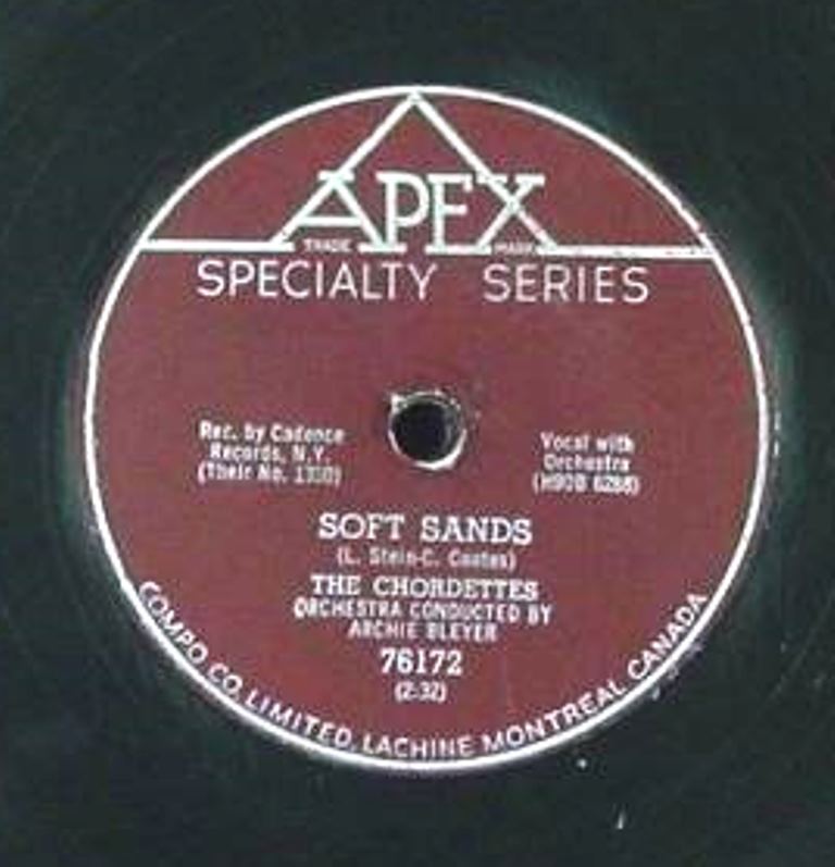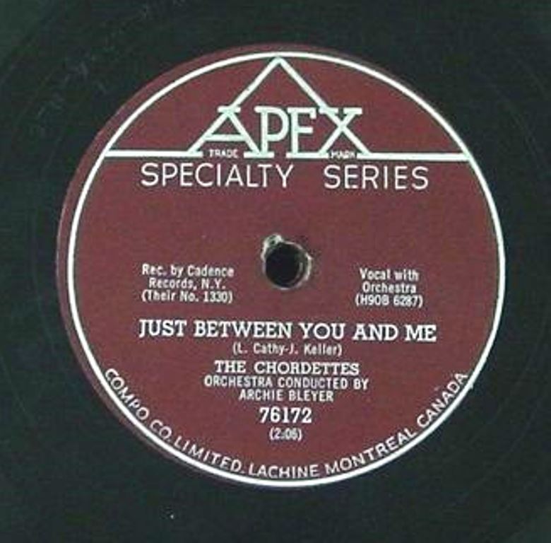 07 57....1330....THE CHORDETTES Orchestra Conducted By ARCHIE BLEYER..Just Between You And Me (H9-OW-6287)/Soft Sands (H9-OW-6288)
