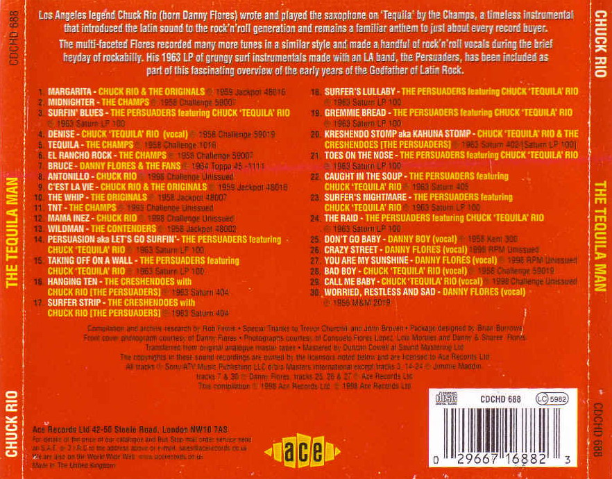 Bei dem Pseudonym "Danny Boy" muß man vorsichtig sein, da es sich nicht immer um Chuck Rio handelt. Beispielsweise wird oft die TIFCO 824 "Wild Women"/"Kokomo Me Baby" zu Chuck Rio gerechnet, obwohl es sich um den Blues-Gitarristen Danny Boy Thomas handelt. Bei DOT 16140 "Yea-De-A-Hay"/"Send Me Some Lovin'" bin ich mir etwas unsicher ich hoffe aber, wenn es sich nicht um Chuck Rio handeln sollte, dass einer von euch sofort Einspruch erhebt. Bei der KENT 300, es war übrigens die erste KENT-Veröffentlichung, bin ich mir ziemlich sicher, da Flores (=Chuck Rio) als Autor aufscheint.