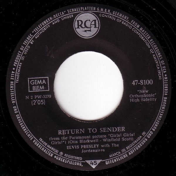 Heute : Return To Sender im Original von ELVIS PRESLEY / RCA 47-8100