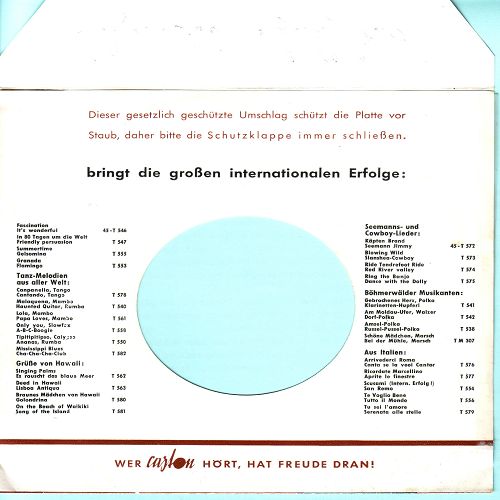 Hier noch eine kuriose (zumindest für mich) Plattenhülle mit gesetzlich geschützter Schutzklappe. Finde ich urig. Die Programm-Disco auf der Rückseite ist sher informativ. Dazu noch meine zwei CASTONs zur Ergänzung