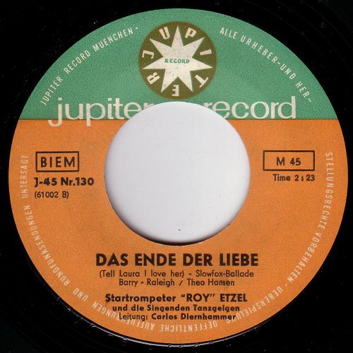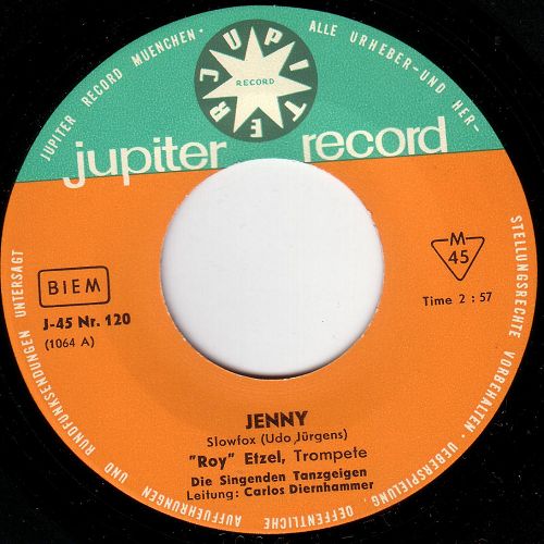 Das JUPITER Label war vielleicht nicht unbedingt "das" Label für Einige von diesem Forum, aber es hat zu "unserer" Zeit existiert und noch eine Zeit darüber hinaus. Immerhin gab es mindestens einen Chart-Erfolg mit Roy Etzels Instrumental-Version von "Jenny" die zwar nur den 36. Platz erreichte aber immerhin 16 Wochen in den Charts vertreten war. Neben den eher uninteressanten Instrumentals (eigene Meinung) gibt es interessante deutsche Fassungen einiger US-Titeln. Ein Beispiel dafür hat Albert bereits vor einiger Zeit geliefert: