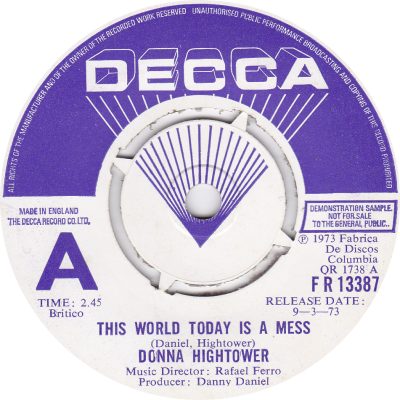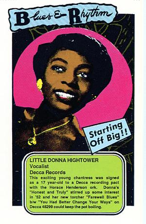 Hightower was born in Caruthersville, Missouri on December 28, 1926, and is the oldest of nine children. Her family was typical of many poor Southern African-American sharecropping families and she remembers spending many days working as a field hand for $1 a day, picking cotton. Her father didn’t believe in education so she had very little formal schooling until much later in her life. She remembers getting in trouble for listening to radio programs and daydreaming of life better than what she saw around her. Being very determined to get out of that lifestyle, she married early and had two children. Since her first husband was in the military, they moved often and called many cities “home” for short periods of time, including St. Louis, Missouri and Gary, Indiana. After their divorce in the late 1940’s, she moved to Chicago, Illinois and lived with her cousin. She was first discovered in 1951 while working as a cook in Chicago. Bob Tilman, a reporter for the “Chicago Defender” was in the diner having lunch, when he commented to a waitress that he really liked the vocalist singing "Star Dust." He asked if she would turn up the radio so that he could hear the orchestra's arrangement. The waitress looked confused, so he repeated his request again. Finally, she told the reporter that they didn't have a radio and said, "oh, that's just Donna...she drives us crazy with her singing all the time!" He asked to meet Donna, and asked if she had an engagement performing somewhere. While she wasn't singing professionally at the time, he introduced her to Benny Stroller, owner of the Strand Hotel Lounge at 63rd and Cottage. She auditioned for him by singing Ella Fitzgerald's "Love You Madly," Dinah Washington's "Baby Get Lost," and "one of Sinatra's songs." Mr. Tilman negotiated with Stroller, who offered her $35 a week to sing with Horace Henderson's orchestra in his nightclub. Donna was excited as it was the same amount as she was getting paid to work all week long at the diner. Later, Belinda and Bill Putnam, a husband and wife talent scout team from Decca Records, approached her in the club and asked if she had any original material. Ms. Hightower states that “since I didn’t have a clue of what they were talking about, I said no. They asked me if I had ever written a song. I asked, ‘what kind of song?’ Belinda said that she wanted an answer to Muddy Water’s ‘I'm in The Mood.’ I had to write ‘I Ain’t in the Mood.” Hightower says that she went home that night and stayed up all night and wrote the lyrics to "I Ain't in the Mood.” (NOTE: This may have been John Lee Hooker’s “I’m In The Mood.”) About three weeks later, on October 9, 1951, she went into the recording studios and cut her first sides with Horace Henderson’s band. Her first single, “I Ain’t in the Mood,” was backed with her cover of Johnny Ray’s “Cry.” While she didn't receive credit for having penned “I Ain’t in the Mood,” she did receive some acclaim with her debut single. During these early days in her career, she was billed as “Little Donna Hightower.” The single was released in December, 1951. Several other sides were recorded for Decca in Chicago through April of 1952, though none were hits. Several of these sides feature overdubbing of Hightower’s voice, a technique introduced (with the advent of magnetic tape recording) and popularized by vocalists, Patti Page, Mary Ford, and Connee Boswell in the late 1940’s/early 1950’s. She spent three months performing at the Strand Hotel Lounge, followed by a few weeks stay at the Crown Propeller in Chicago. After the release of “I Ain’t in the Mood,” she went to Minneapolis, MN and performed at the Key Club. There, she performed with the Hank Hazlett Trio. She recalls this group included guitarist, Hank Hazlett, who “was a wonderful man,” Maurice Turner on bass, and a man named Buddy, who played piano. Ms. Hightower says, “we were one big family. Hank’s wife was a tall woman named Edith, Buddy’s wife was Mercedes, and Evelyn was Maurice’s wife.” Ms. Hightower recalls that Minnesota “was getting colder,” so she returned to Chicago in 1953. She was disappointed to find little work so she moved to Indianapolis, Indiana and again found little opportunity. In 1954, she and her friend Pat drove from Indianapolis to Los Angeles, CA to deliver a car. They found a place to stay in West Hollywood. Ms. Hightower recalls, “as luck would have it, Donna and Pat would hang out at a small hotel on the strip, across the street from the Creshendo- one block and a half from Ceros, where Sammy Davis (Jr.) had two rooms. The hotel was called Sunset Colonial.” Apparently, Donna and Pat rented one of the rooms from Mr. Davis for a while. (She remembers Sammy Davis, Jr. as being one of the nicest people that she met in show business.) When she first got to California, she needed money and went to work as a maid. She remembers the lady that hired her asked if she was in show business. She needed the work so she told her, “no.” The lady reportedly told her that if she ever found out that she was in show business, she would be fired. As fortunes would have it, she landed a gig on a television program that featured the Platters, Duke Ellington and others. It was filmed but wasn’t broadcast until later. She arrived for work one morning, not knowing that the program had been broadcast and was promptly fired on the spot by the lady. “Since it was a new thing for a White person and a Black to live together, (Pat) decided to send for (a) friend in Indianapolis to come out to help her pay the rent.” Donna got a new roommate, who was ‘a tall, beautiful Black girl named Barbara Walden. She let me share her one room and a half. We were like sisters.’” This friendship was a fortunate one for Ms. Hightower. “She was a girl from a well-to-do family from Camden, New Jersey. She knew a lot of people in Hollywood. Bec
