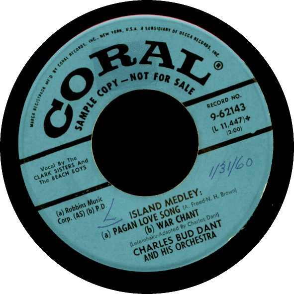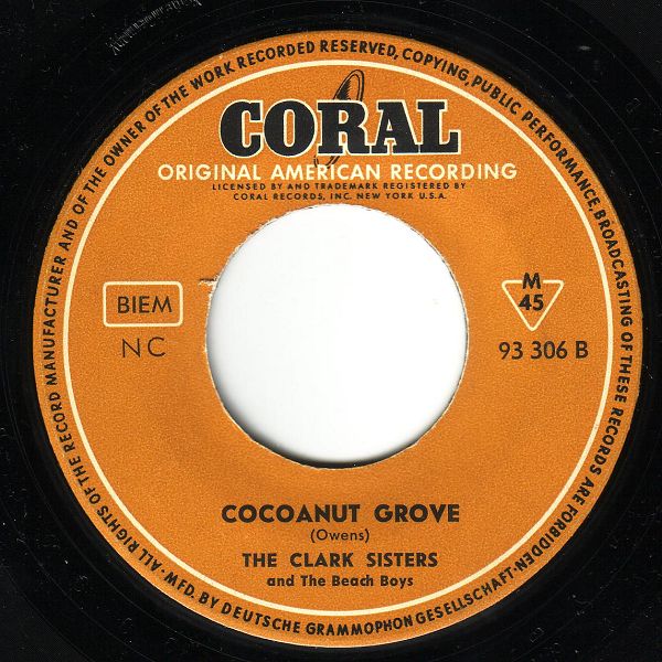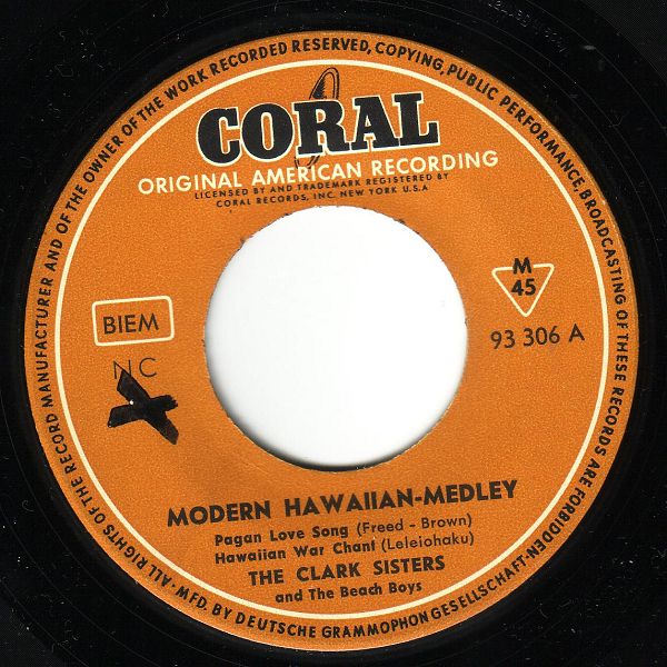 12 59....93 306 A....280 306 A....THE CLARK SISTERS and The Beach Boys..MODERN HAWAIIAN-MEDLEY..Pagan Love Song..Hawaiian War Chant/ B....Cocoanut Grove (CORAL LP 57270)