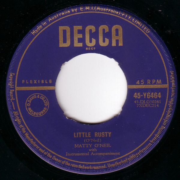 In meiner Sammlung befindet sich eine australische DECCA von Matty O'Neil und da ich über diese Dame nur Obskures fand, wollte ich sie im Forum vorstellen mit dem Hintergedanken, von euch etwas mehr von ihr zu erfahren. Plötzlich öffnete sich ein Tor (nur bildlich gesprochen) und es erschien eine Dame, die sogar schon ein eigenes Buchstaben-Forum bei uns hatte und von der wir glaubten, dass es nur zwei, drei Singles von ihr gibt. Hier folgt nun die Auflösung
