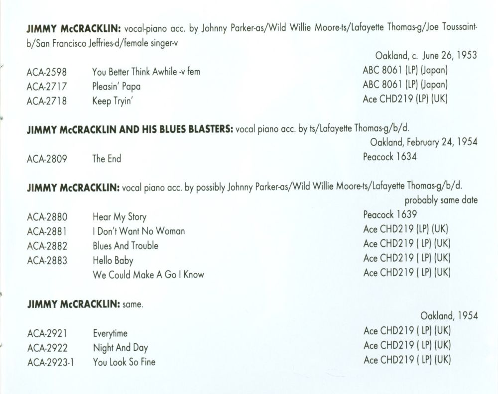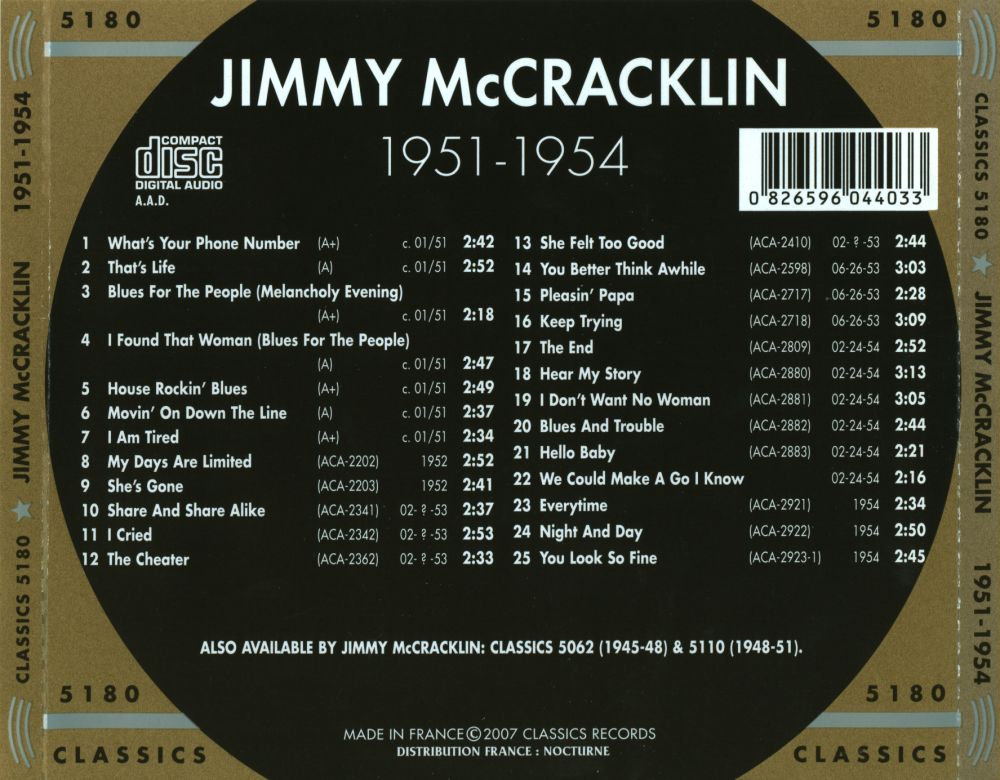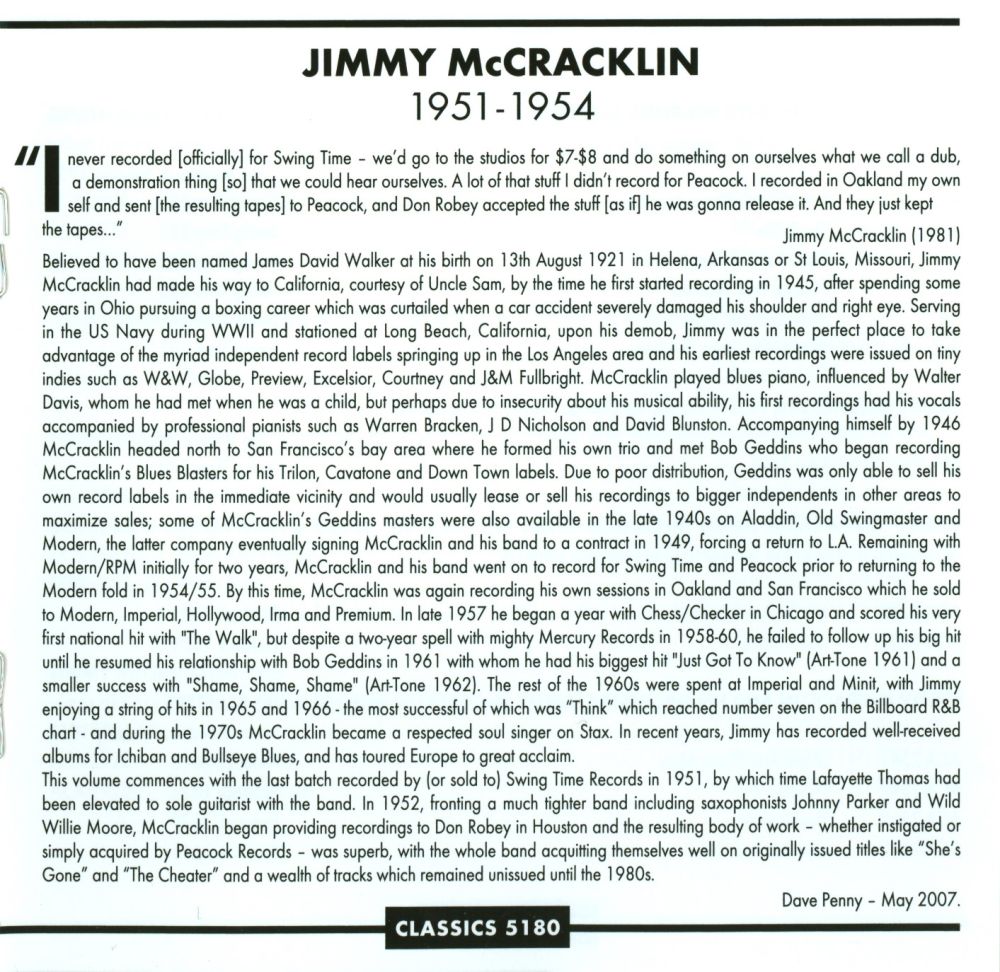 Jimmy McCracklin, der bei seiner Geburt am 13. August 1921 in Helena/Arkansas oder St Louis/Missouri vermutlich James David Walker hieß, hatte sich mit freundlicher Genehmigung von Uncle Sam bereits in Kalifornien niedergelassen, als er 1945 seine ersten Aufnahmen machte, nachdem er einige Jahre in Ohio verbracht hatte, um eine Boxkarriere zu verfolgen, die jedoch durch einen Autounfall, bei dem er seine Schulter und sein rechtes Auge schwer verletzte, beendet wurde.
