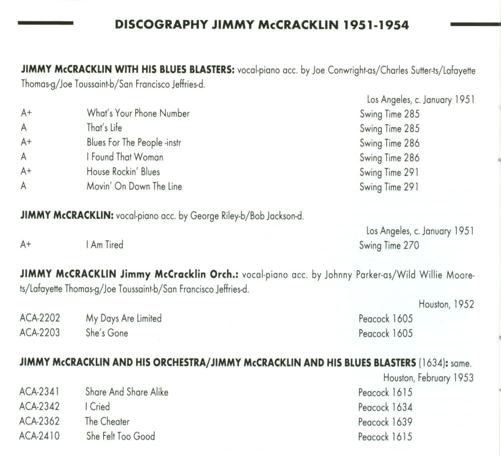 „Ich habe nie [offiziell] für Swing Time aufgenommen – wir gingen für 7 bis 8 Dollar ins Studio und machten selbst etwas, das wir „Dub“ nennen, eine Demo, [damit] wir uns selbst hören konnten. Vieles davon habe ich nicht für Peacock aufgenommen. Ich habe es selbst in Oakland aufgenommen und [die entstandenen Bänder] an Peacock geschickt, und Don Robey nahm das Material an, [als ob] er es veröffentlichen wollte. Und sie haben einfach die Tapes behalten...“ Jimmy McCracklin (1981)