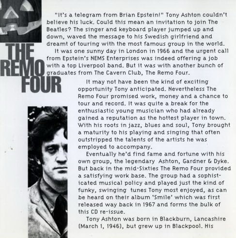 Die Band wurde 1959 in Liverpool gegründet und begleitete zunächst die Sänger Johnny Sandon und Tommy Quickly bei Konzerten und Schallplattenaufnahmen. 1964 erschienen die beiden ersten Singles der Band unter eigenem Namen. Daraufhin nahm der Beatles-Manager Brian Epstein die Remo Four unter Vertrag und vermittelte ihnen 1965 einen längeres Engagement im Hamburger Star-Club. Hier fanden sie ihren Erfolg, der ihnen in Liverpool verwehrt geblieben war. Ein Auftritt im Beat-Club mit einer neu arrangierten Version von Peter Gunn machte sie in ganz Deutschland bekannt. Die Band überzeugte live, brachte es aber auch in Deutschland nur zu wenige Plattenveröffentlichungen. Ihr einzige LP "Smile" nahmen sie 1967 im Tonstudio von Joe Menke in Maschen auf. Ende des Jahres 1967 löste sich die Band auf. Tony Ashton und Roy Dyke gründeten zusammen mit Kim Gardner (†24.10.2001) die Gruppe Ashton, Gardner & Dyke. Ihr bekanntester Song "Resurrection Shuffle" kam 1971 auch in die deutsche Hitparade (#22). Roy Dyke lebt seit vielen Jahren wieder in Hamburg.