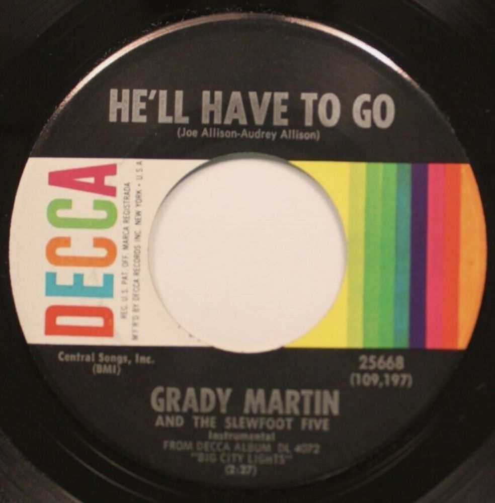 Wieder zurück zum Themen-Titel. Ich bin zwar kein Fan des 3/4-Taktes, aber "He'll Have To Go" war chart-mäßig sein größter Erfolg (Platz 2) und daher nahm ich diesen Titel spät aber doch in meine Sammlung auf. Auch in unserem Bereich dürfte der Erfolg groß gewesen sein denn Mitte 1963 oder sogar später wurde noch eine Bildhülle neu gedruckt (siehe die wunderschöne Western-Hülle von Ralf). In den USA gab es auch eine Parodie über diesen Titel (siehe Homer & Jethro-Single von Billy). Und jetzt kommt doch noch das Original das auch bei uns Anfang 1960, vermutlich noch ohne Bildhülle, zu haben war