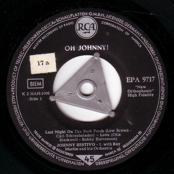Wie dieser Beitrag gestartet wurde, war die Struktur des Forums noch völlig anders und nach der Umstrukturierung wurde er dem Buchtaben-Forum "R" (Restivo) zugeordnet. Der eigentliche Ansatz des Beitrages war allerdings Restivo's Titel "The Shape I'm In" und irgenwie ist er in diesem Ansatz stecken geblieben, obwohl er mit einigen persönlichen Bildern und LP's-Scans bereichert wurde. Dieter's Bild-Cover von "The Magic Age Of Seventeen" hat mich darauf aufmerksam gemacht, dass ich noch einige Singles von Johnny habe, die noch garnicht den Weg in's Forum gefunden haben. Nun ein "gemischter Satz" aus deutschen, britischen und amerikanischen Pressungen. Außerdem wird auch die interessante EP, die TELDEC aus vier Titel der LP "Oh Johnny" (RCA Victor LPM-2149) fabriziert hat, gezeigt. Aber vorher noch eine Kurz-Bio sowie eine Single-Disco.