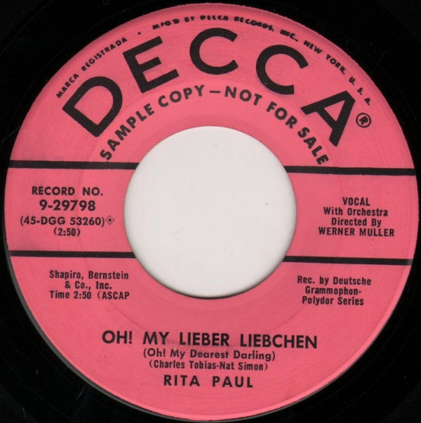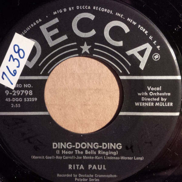 ?? 55....23 100 A....Rita Paul Werner Müller mit dem RIAS-Tanzorchester, Berlin..Baby – ich geh' mit Vati aus/ B....In der Nacht (Heut' sprach ein Mann) DECCA (USA) 12 55....9-29798....RITA PAUL..Ding-Dong-Ding (I Hear The Bells Ringing) (45-DGG 53259)/Oh! My Dearest Darling (Oh! My Lieber Liebchen) (45-DGG 53260) (D: POLYDOR) *) POLYDOR (D) 02 56....23 141 A....Rita Paul und Bully Buhlan Werner Müller mit dem RIAS-Tanzorchester, Berlin..Was, du brauchst schon wieder Geld/ B....Das kann doch keine Sünde sein