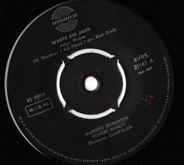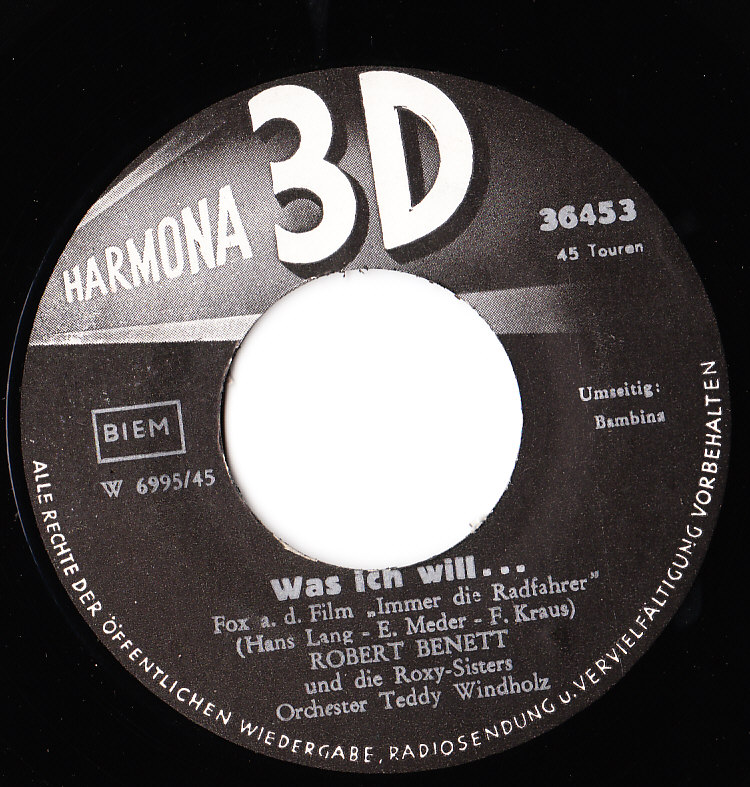 ROBERT BENETT, ab 1957 Harmona 3 D (u.a. 36432 "Der Blick Einer Liebenden Frau (Woman In Love)" u. Die ROXY-SISTERS & Das Orchester TEDDY WINDHOLZ/"Alle Wasser Der Erde" & Das Orchester HERBERT SEITER, 36433 "Nimm Die Menschen So Wie Sie Sind" u. Das Orchester TEDDY WINDHOLZ, 36453 "Was Ich Will …"/"Bambina" u. Die ROXY-SISTERS & Das Orchester TEDDY WINDHOLZ, 36467 "Non, Cherie" u. Das Orchester TEDDY WINDHOLZ, 36468 "Noch Einmal Bis 110" & Das Orchester HERBERT SEITER, 7009/45 "Total Verrückt (All Shook Up)"/"Das Freut Mich So (Jive After Five)" u. Das Orchester TEDDY WINDHOLZ, ?? "Come Prima"/"Total Verrückt"), als ROBERT BENETT Trio auf Donauland (Nr. 1121 "Nimm Die Menschen Wie Sie Sind" u. Das Orchester TEDDY WINDHOLZ, Nr. 1136 "Sag, Wieso (Baby, I Don’t Care)" & Die ROXY-SISTERS u. Das Orchester TEDDY WINDHOLZ, Nr. 1147 "Insgeheim (Secretly)"/ "Was Ich Will …" & Die ROXY-SISTERS u. Das Orchester TEDDY WINDHOLZ, Nr. 1171 "Noch Einmal Bis Hundertzehn" & Das Orchester HERBERT SEITER), 1960 Amadeo (21146 "Du Wirst Mir Fehlen"/"Ein Neues Leben" & Die ROXYS & Neues Wiener Solistenorchester, 21147 "Warte Ein Jahr" & MARGRIT SÖRENSEN & Orchester CARROLAN/"Wenn Ich Schau In Das Blau Deiner Augen" & Das Orchester HERBERT SEITER, 21157 B "Jukebox-Baby", 21172 Alle Wasser Dieser Erde & Das Orchester HERBERT SEITER/"Total Verrückt (All Shook Up)" u. Das Orchester TEDDY WINDHOLZ, 21187 "Du Und Die Sonne Von Peru" & Die ROXYS & Das Orchester TEDDY WINDHOLZ /"Glaub An Die Zukunft" & Die ROXYS & Orchester PETER STERN)
