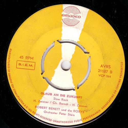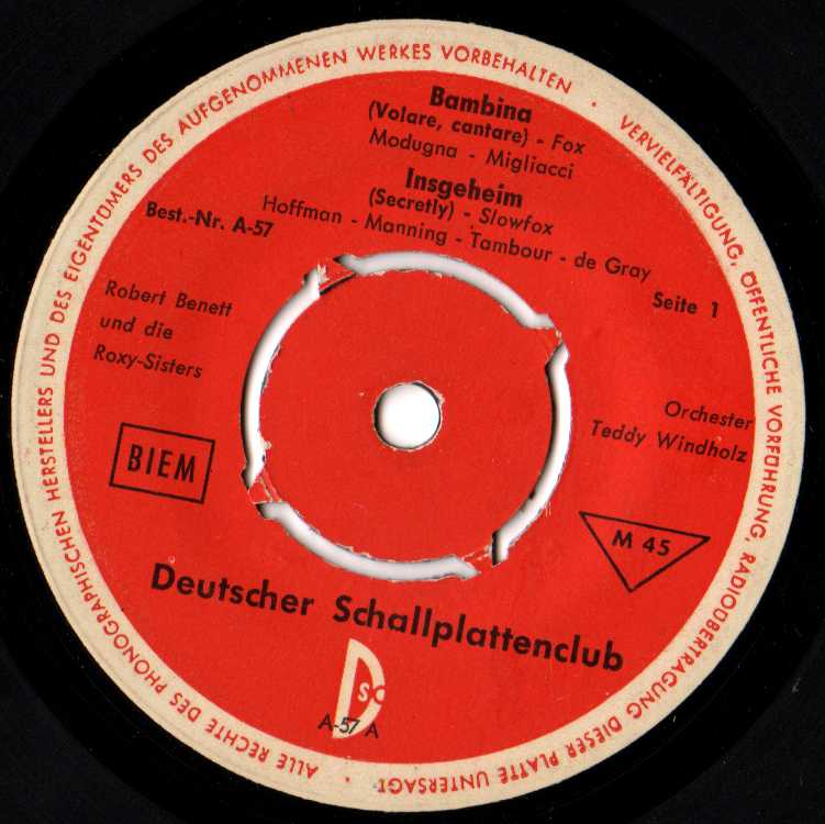 ROBERT BENNET, Juni 1959 auf Decca 18989 ("Alle Engel Sind Blond"/"Blue Jean Ball" & Die BLUE STARS u. Das Tanzorchester TONY MILLS), DSC Deutscher Schallplattenclub (u.a. A 57 "Bambina (Volare)"/"Insgeheim (Secretly)" & Die ROXY-SISTERS u. Das Orchester TEDDY WINDHOLZ, A 61 "Was Ich Will" & Die ROXY-SISTERS u. Das Orchester TEDDY WINDHOLZ, A 62 "Total Verrückt (All Shook Up)"), weitere Titel auf Amadeo, Titel auf 4-teiliger Bear Family Records-LP-Serie "Elvis Hits In Deutsch"-1985