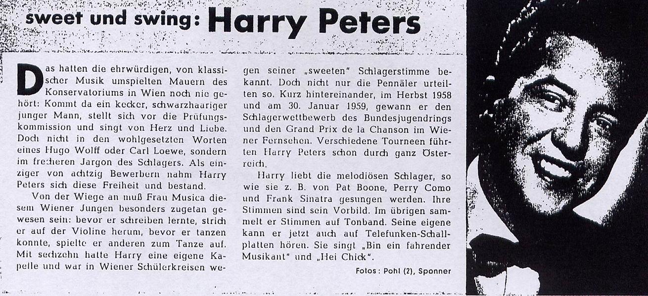 Im Netz (MemoryRadio) fand ich eine Biographie aus der sehr plausible geschlossen werden kann, dass es in der Schlager-Branche nur einen Harry Peters gab der dann, gefördert von Herbert von Karajan, etwa 1964 auf Klassik umsattelte und Bassist in der Wiener Staatoper wurde. Ich habe daher beide Foren vereint. Ich werde für die folgende Kurz-Bio diese für mich neuen Daten stichwortmäßig verwenden.
