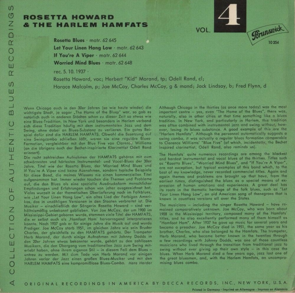 Rosetta Howard startete ihre Karriere, wo sie mit den Harlem Hamfats, Herb Morand und Odell Rand auftrat und Plattenaufnahmen machte. Von 1937-1939 und 1947 war sie bei Decca Records unter Vertrag (u.a. „Men Are Like Streetcars“-1939 auf Decca 7618). 1947 wurde sie u.a. von Big Bill Broonzey und The Big Three begleitet, deren Bassist Willie Dixon war. Trotz der prominenten Namen verkauften sich ihre Werke nicht sonderlich gut, so dass sie sich in den frühen 50er Jahren zurückzog, um fortan in der Kirche tätig zu sein.