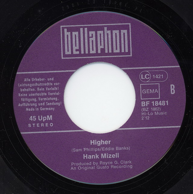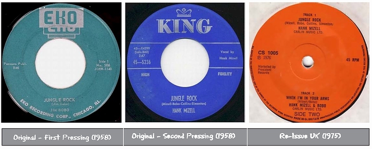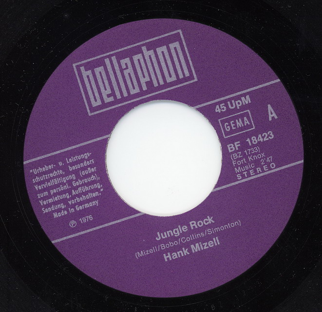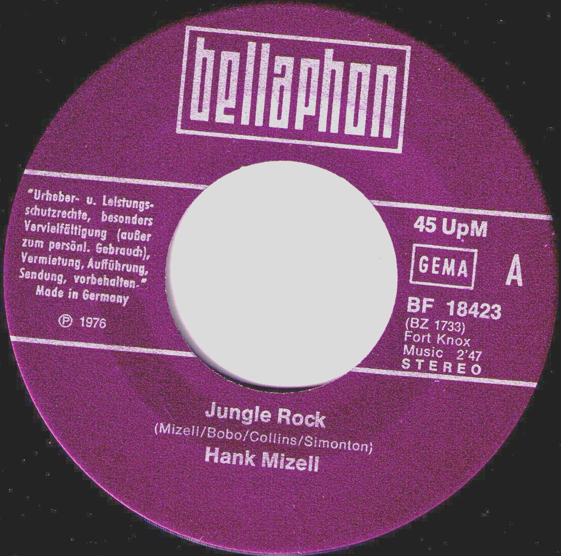 50 Cent mußte ich für Frank Rothe und seine Deutsche Originalversion von Hank Mizell's "Jungle Rock" auf dem Flohmarkt entrichten. Die flotte Scheibe aus 1975 weckte meine Neugier. Mit dem Original Artist, Hank Mizell, wußte ich wenig anzufangen. In den holländischen Charts kam Hank Mizell 1975 auf Platz Nummer 1. In meinen Ohren klang das nach 50's Rockabbily und so ist es auch.
