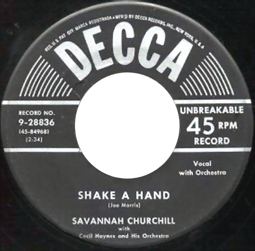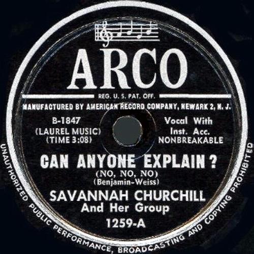 Savannah Churchill wurde am 21. August 1920 in Louisiana geboren. Sie ist am 19. April 1974 in New York gestorben. Erste Plattenaufnahmen hat sie 1942 u.a. an der Seite Benny Carter's gemacht. Auf der amerikanische Wikipedia Seite wird ihr das Original von "Shake a Hand" (Faye Adams) zugeschrieben (was ich bezweifele). Vielleicht kann Dieter uns diese vergessene Künstlerin ein wenig näher bringen? Eine brauchbare, wenn auch nicht vollständige Discografie findet man hier: http://www.geocities.com/doo_wop_gino/savannahdisc.htm. Ich stelle hier zunächst ein paar ihrer 78er Platten vor ... Beacon Label (1942 - ihre erste Scheibe überhaupt) und auf dem Manor-Label (1946).