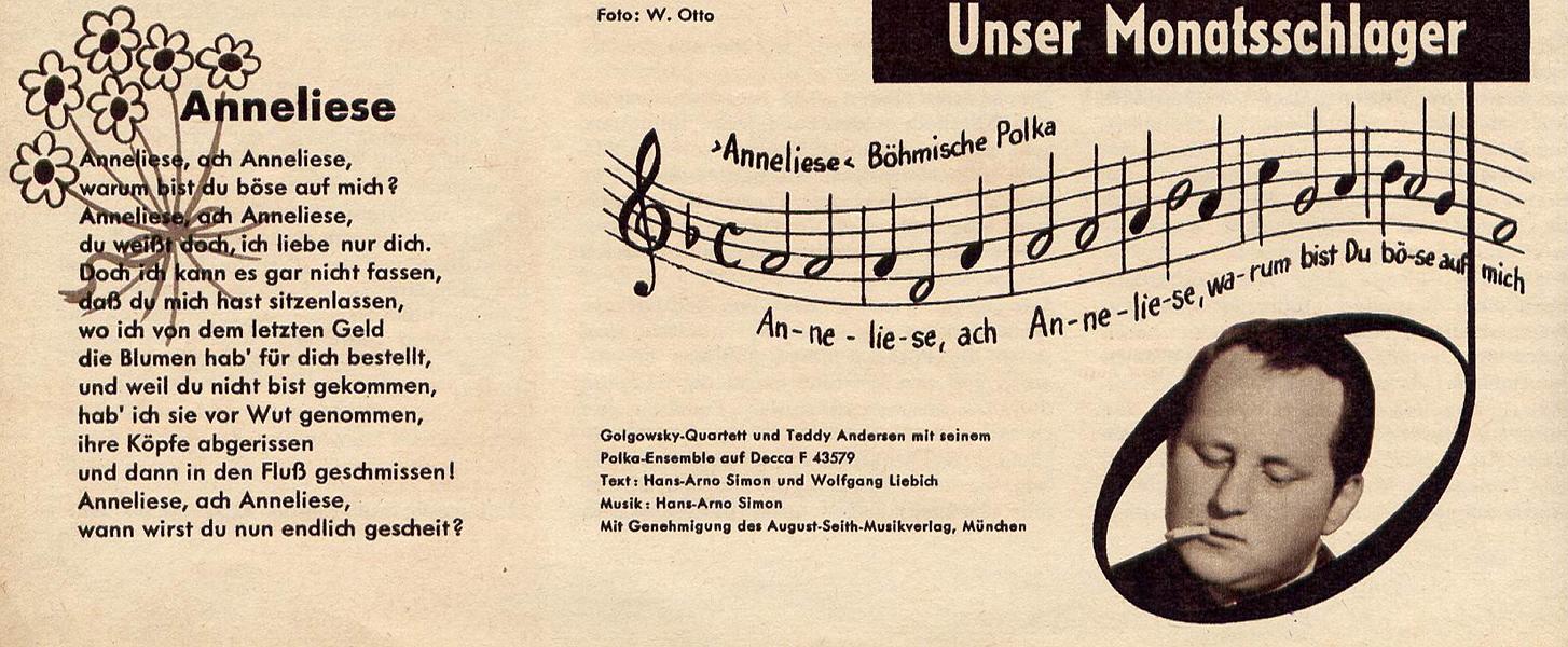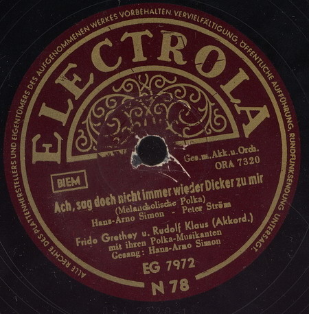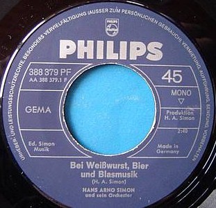 SIMON, HANS ARNO * 19.09.1919 in Breslau, + 23.07.1989 in Murnau, Musiker, Komponist u. Textautor u.a. der humorige Vater der "Anneliese"-1953, "Ach, Sag Doch Nicht Immer Dicker Zu Mir"-1953, "Gib Mir Den Wodka Annuschka"-1954, "Abends Am Lago Maggiore", Sänger, 1938 Abitur in Breslau, Studium an der Universität Breslau (Musik, Germanistik, Regie u. Schauspiel), Sprecherzieher, 7,5 Jahre Wehrmacht, Kriegsgefangenschaft, Neubeginn beim NWDR Hamburg, ca. 1000 Sendungen als Pianist u. Klavierduo mit PATRICK HOFFMANN (1946 Hamburger Klavier-Duo mit HANS-ARNO SIMON auf Deutsche Grammophon u. Polydor- Magazin „Melodie“ 1947/10), ab 1951 exklusiv Solopianist bei Telefunken, später bei Electrola u. Philips (345094 "Rosa Organdy"/"La Paloma"-1958, 345111 "Hula Hoop"/"Herr Admiral"-1958, 345112 "Ja, So Sind Die Böhmen"/"Slibowitz-Polka"-1958, 345179 "Boing-Boing-Boing"/"Liebe!-Brautpaar!-Hochzeit!-Standesamt!"-1959), Decca 19034 ("Blaue Seide"/"Schwarzer Nylon"-1960), 1951 HANS-ARNO SIMON und sein CASINO-SEXTETT, 1955-62 Polydor, 04.06.1961 Platz 8 bei den 1. Deutschen Schlager-Festspielen ("Die "Ohne Dich"-Polka"), 1962 Metronome M 333, ab 1952 NWDR-TV, 5 Jahre eigene Show "Klingendes Rendevouz", eigener Musikverlag u. Schallplattenlabel (Simon Records), Filmmusik "Frau Im Besten Mannesalter"-1958