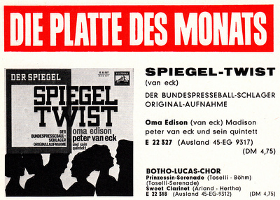 van ECK, PETER (FELIX JOSEF SCHWARZ) * 29.08.1927 in Bernstorf (heute Tschechien), seit 1938 in Berlin, Mitglied der Rundfunkspielschar (Untergruppe der Hitlerjugend), seit 1941 Orchesterschule (Hauptfach: Fagott) in Berlin-Charlottenburg, Konzertorchester der Musikhochschule, insgeheim Studium auf Saxophon u. Klarinette, 1942 Mozartchor, 1944 als Truppenbetreuer mit einer Band in Italien, seit Sept. 1944 an der Ostfront, 1949 Rückkehr aus der Kriegsgefangenschaft, Wiederaufnahme des Fagott-Studiums in Berlin, nebenbei Verdienst als Untehaltungsmusiker, Gründung des „Tusma-Tanzorchester“ (& HORST JANKOWSKI), 1953 Abschluss-Examen, tat sich mit dem Pianisten Eberhard Nickel zusammen, der die weibliche Gesangstruppe „die Nicolets“ leitete, die Original-Nicolets hatten sich allerdings abgesetzt, Schwarz und Nickel stellten 1953 eine neue „Nicolets-Truppe“ zusammen, die Truppe tourte in Afrika und auf Zypern, wo sie endgültig auseinanderbrach, nach der Rückkehr Mitte der 50er Jahre stellte Schwarz mit seinem Bruder Horst an der Gitarre u. der Sängerin Jutta Lenz ein Quartett auf die Beine, mit dem er ein Engagement in München annahm, Jutta Lenz wurde kurze Zeit später seine erste Frau, die Ehe ging nach kurzer Zeit in die Brücher, Schwarz versuchte sich in Ostdeutschland kurze Zeit als Holzhändler im Geschäft des ehemaligen Schwiegervaters, bereits in den ersten Tagen des Jahres 1956 stand er mit Bela Martinelly an der Gitarre u. Erwin Schwarz (nicht verwandt mit Felix Schwarz) am Klavier wieder auf der Bühne, den Vornamen „Felix“ hatte er abgelegt, er nannte sich nun Peter Schwarz, weil „dies moderner klang“, gemäss den Aussagen von Schwarz hiess die Band im Westen „Peter Schwarz Band“, im Osten trat er mit dem Trio als „Panamas“ in Erscheinung, Ende 1956 nahmen die „Panamas“ für Amiga die Single „Some of these days/I´m confession“ auf. In dieser Zeit wird das Orchester für Aufnahmen zum Film „Italienreise – Liebe inbegriffen“ verpflichtet, in dem Film spielt die Band zwei Nummern, die aber nie auf Platte erschienen sind, zwei Jahre lang spielte die Formation, die später durch den Sänger CARLOS MIRANDA ergänzt wurde in einem Promilokal in Berlin, das Gastspiel endete mit dem Rausschmiss von Schwarz, weil er ein Verhältnis hatte mit der Frau des Clubbesitzers, deshalb gründete er 1959 mit drei Musikern aus Leipzig und einem Schlagzeuger aus Berlin eine neue Band, das Peter Schwarz Quintett, die Band gehörte schnell zur Spitzenliga der Tanz- und Showorchester, ein erfahrener Künstleragent riet Peter Schwarz, den deutschen Familiennamen durch einen internationalen zu ersetzen, weil vor allem in den Beneluxstaaten Vorbehalte gegen alles Deutsche existierten, vor dem ersten Auslands- Engagement taufte sich Peter Schwarz in Peter van Eck um, neu hiess die Band „Peter van Eck Quintett“ (Besetzung: Peter van Eck, Klarinette, Gesang, Rolf Hertel, Klavier, Orgel, Arrangements, Eberhard Meissner, Trompete, Akkordeon, Kurt Marschall, Schlagzeug, Kai Weinand, Bass), 1959 bis 1970 spielte die Band am Bundespresseball zum Tanz auf, ca. 1959 Peter Schwarz Combo, 1962 Electrola (22327 "Spiegel Twist"/"Oma Edison" und sein Quintett), der Bayrische Rundfunk setzte den „Spiegel-Twist“ auf den Index, die Electrola brachte die van Ecks „Spiegel-Twist“ unter dem Titel „Bundespresseball-Twist“ neu auf den Markt, am 19. Januar 1963 findet die Nummer Aufnahme in der Hitparade, sie klettert vor bis auf Platz 42, laut Peter van Eck verkaufte sich die Scheibe über 100.000mal, eine weitere Single mit Electrola entsteht nicht, Metronome M 356 ("Ich Will Immer Rechts Herum (Oh, Marie)"/"Twist-Party" und sein Quintett), auf dem Teka-Label mindestens eine Single ("Cha Cha Christina"/"I Found A New Baby"), in den Jahren 63 und 64 Studiojobs für den Violonisten Franz Löffler gemacht, Orchester Peter van Eck Sextett tourte bis Ende 1970, danach stieg Van Eck in die Gastronomie ein