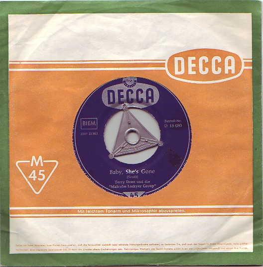 Übrigens ist die hier gezeigt Hülle tatsächlich die richtige Wahl, denn der Sammler von dem ich sprach hatte die Single als Musterplatte aus einem Archiv, dort hatte sie ebenfalls schon die grüne Decca Hülle (die Bestellnummer war auch auf der Hülle zu finden) - und nicht etwa die gelbe Decca Hülle mit dem grünen Rand (wurde für die ältere 18 xxx Serie verwendet, z.B. für Tommy Steele Platten).