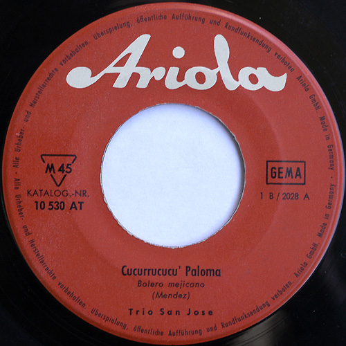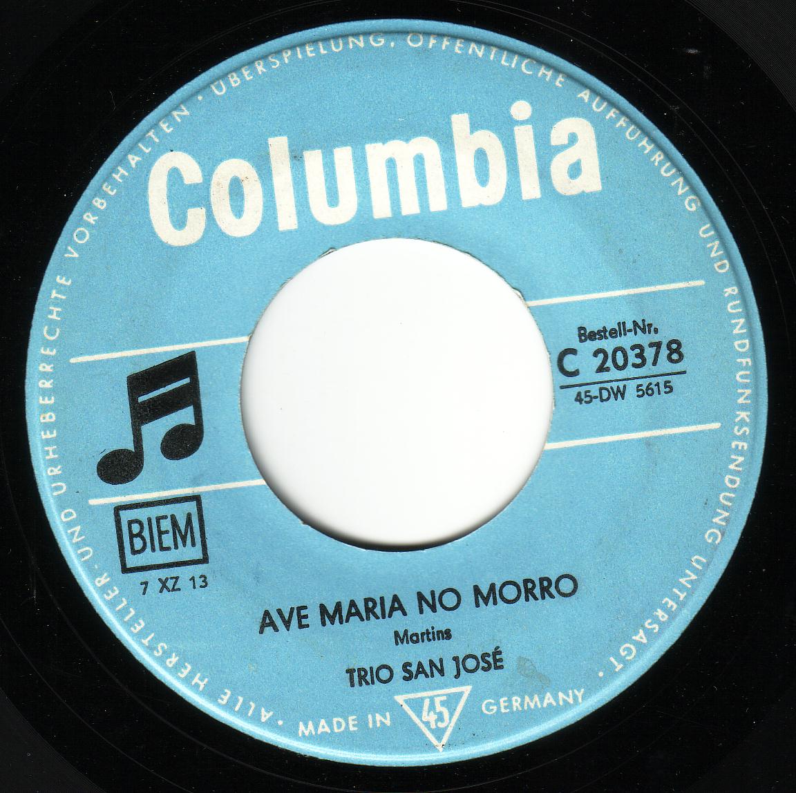 Vielleicht rümpfen jetzt Manche die Nase und sagen sich, "was hat das mit Rocknroll zu tun?". Aber unsere Rocknrollzeit hat sich kaum in den Charts widergespiegelt und darum halte ich es für nicht so unwichtig auch solche Gruppen vorzustellen. Immerhin, in einer Zeit wo Paul Anka's "Lonely Boy" auf Platz 8 kam und Elvis' "I Need Your Love Tonight" auf Platz 15, schaffte es das Trio San José mit "Ave Maria no morro" auf Platz 17. Aber ich gestehe euch meinen Spleen der wirklich zu dieser Themenwahl geführt hat. Da es oft sehr wenige wissen fasziniert es mich ungemein, wenn ein Italiener seinen Hit "Marina" in Belgien aufnimmt, wenn eine spanische Gruppe ihren Hit "Pepito" in Frankreich aufgenommen haben und wenn der größte Hit von José Ivanco, Pedro Prosquellas und Juan Javal, besser bekannt als Trio San José, "Ave Maria no morro" aus der Schweiz stammt. Insbesondere dann, wenn man die Original-Veröffentlichungen fast nie zu Gesicht bekommt. Ich hatte großes Glück und fand irgendeinmal ihre bekannteste Single auf der schweizerischen COLUMBIA und dise Single möchte ich euch nicht vorenthalten. Dazu kommt noch die allseits bekannte hellblaue COLUMBIA in zwei Varianten: Mono und Stereo