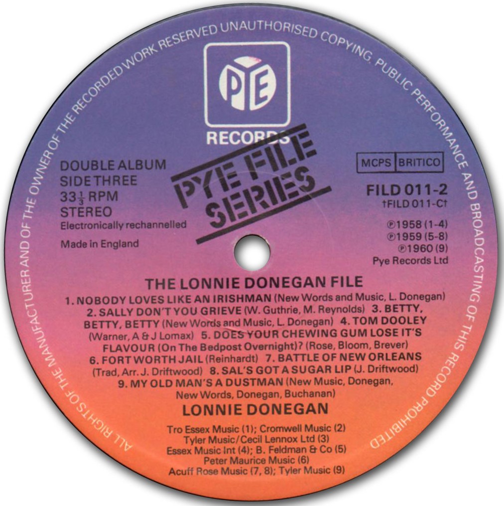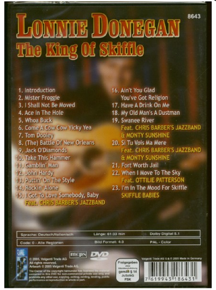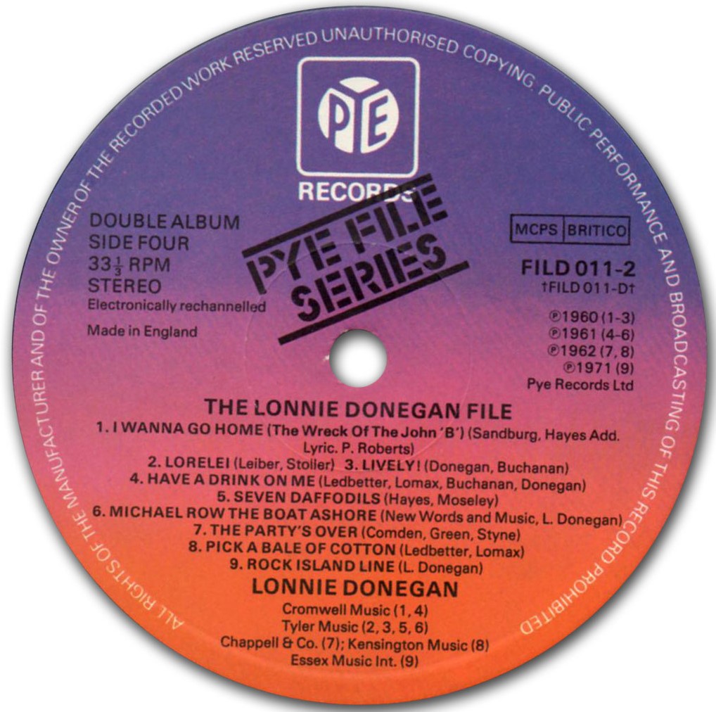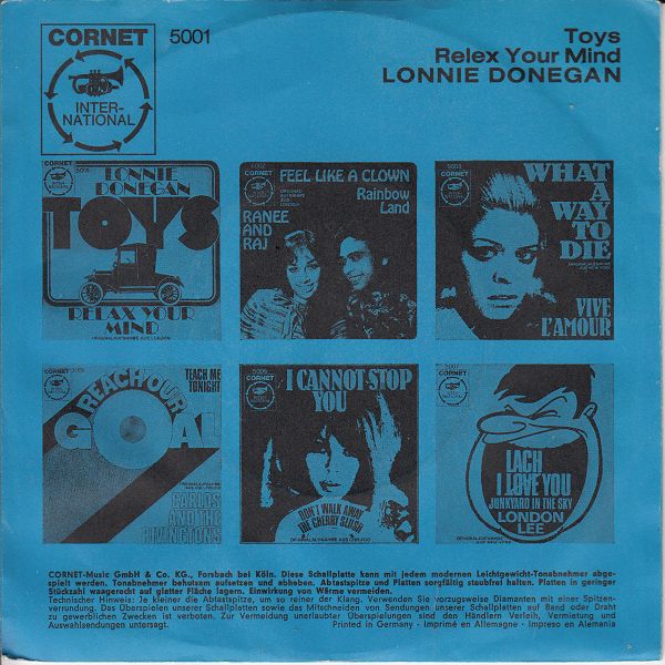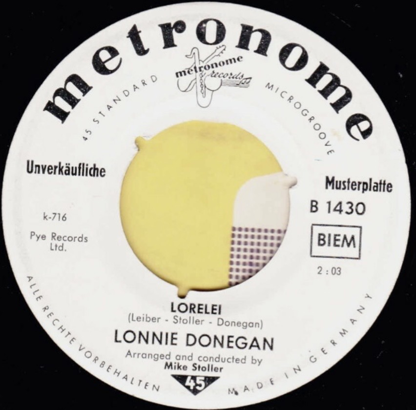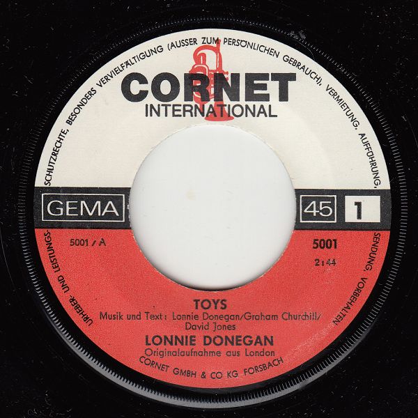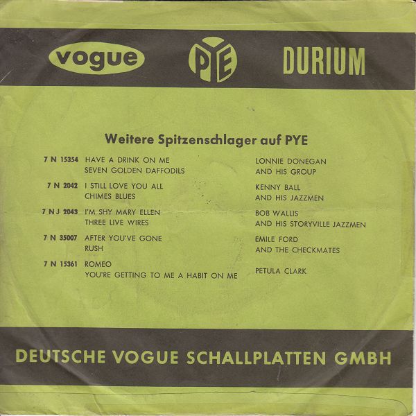Beim Betrachten von Bill´s Cover der Lonny-Donegan-Single "Michael (Row the boat)" dachte ich im ersten Augenblick daran, daß meine Platte ebenfalls mit Cover ist, jedoch mit einem ganz anderen. (Und so schön ist es leider auch nicht, dank einem der Vorbesitzer.) Bestellnummer und beide Titel stimmen überein, bei der Rückseite verblüffte mich einigermaßen der Aufdruck "Deutsche Vogue Schallplatten GMBH" da die Single selbst eindeutig eine englische ist. Das Label auf Gerd´s Scan sieht ein wenig anders aus, vermutlich sind es zwei verschiedene Auflagen. Die Frage ist nun, gab es da eine deutsche Pressung von "Michael" zu diesem Cover (die ich nicht besitze) oder haben die deutschen einfach ein Cover zur englischen Platte gemacht?