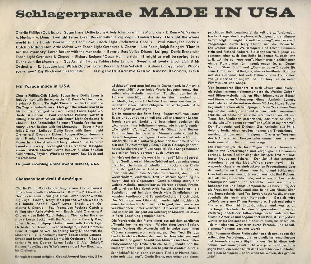 Ich bin mir nicht ganz sicher, ob diese Low-Budget-Aufnahmen auch alle in den USA verwertet wurden (GRAND AWARD, WALDORF MUSIC HALL, TOP TEN TUNES etc.), oder ob es auch Titel gab, die lediglich bei uns veröffentlicht wurden.