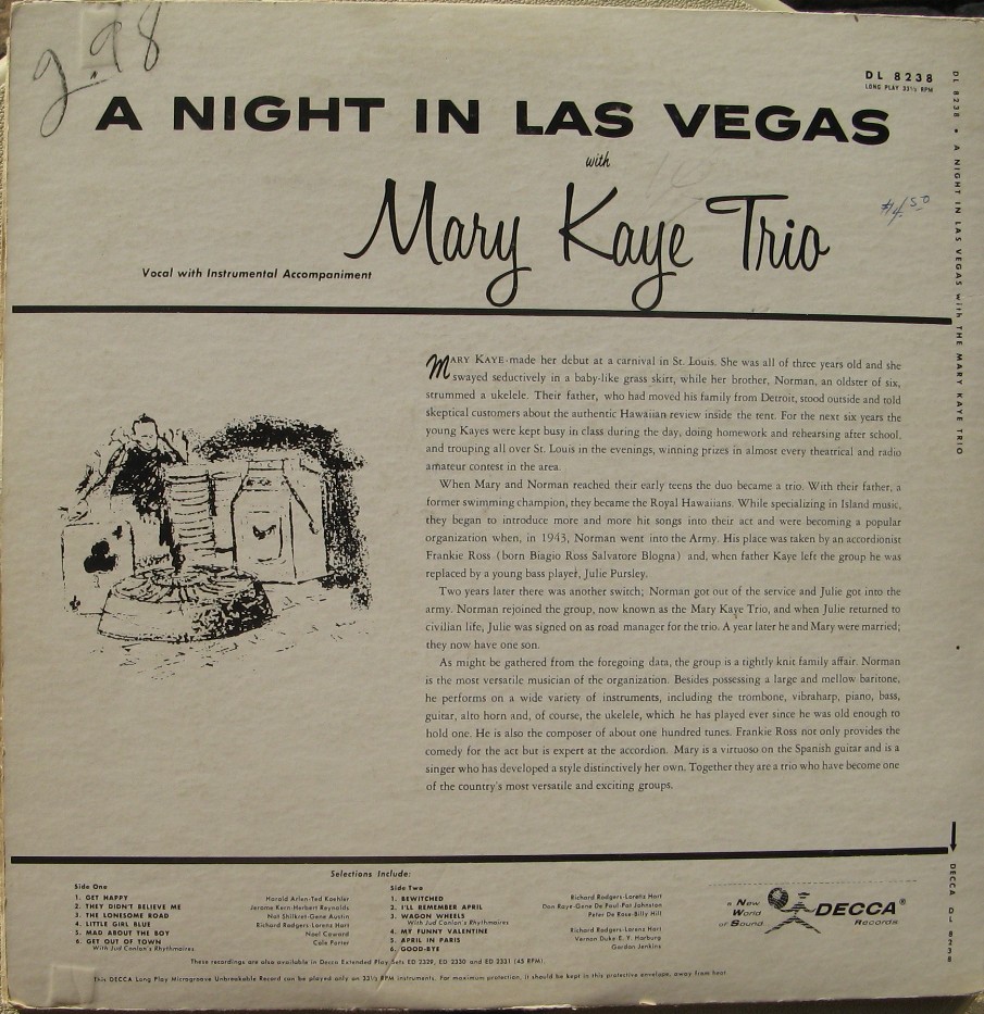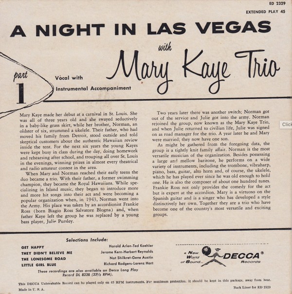 Die Gitarristin und Sängerin Mary Kaye wurde am 9. Jänner 1924 in Detroit, Michigan, als Malia *) Ka’aihue geboren und verstarb am 17. Februar 2007 in einem Spital in Las Vegas, Nevada, an Lungenversagen. Mit Frank Ross und ihrem Bruder Norman Kaye bildete sie das Mary Kaye Trio. Siehe auch Beitrag #11.
