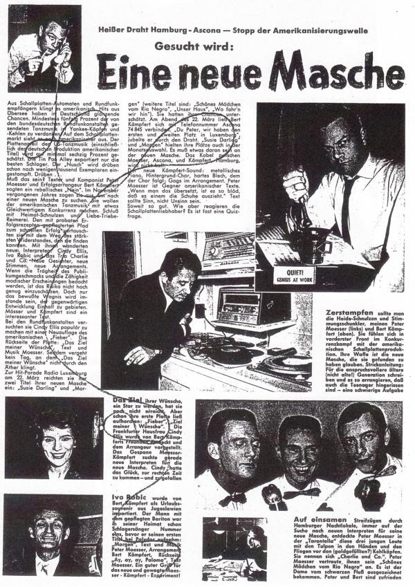 Texter und Komponist PETER MOESSER und der Erfolgsarrangeur (später noch erfolgreicherer Komponist und Orchesterleiter) BERT KAEMPFERT stellten diese Tatsache in Frage. Im Herbst 1958 zogen sie aus, um nach einer neuen Masche zu suchen.