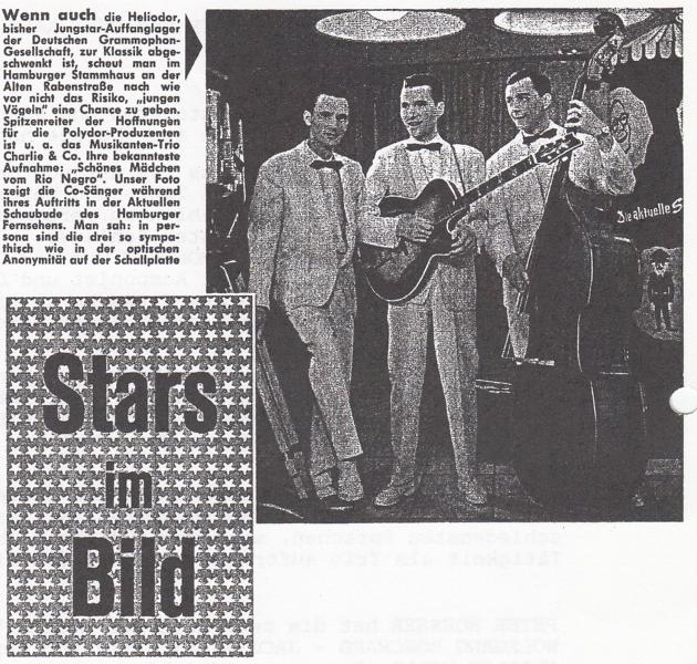 PETER MOESSER hat die zwei Berliner GÜNTER WESSEL (Bass) und WOLFGANG BORCHARD - JACOBY (Gitarre) und den Hamburger Jung CHARLIE MILLE (Trompete und Schlagzeug) entdeckt und ihnen sofort einen Erfolgsschlager auf den Leib geschrieben: "Schönes Mädchen Vom Rio Negro"