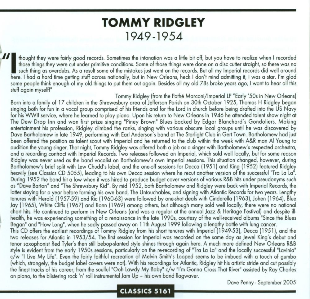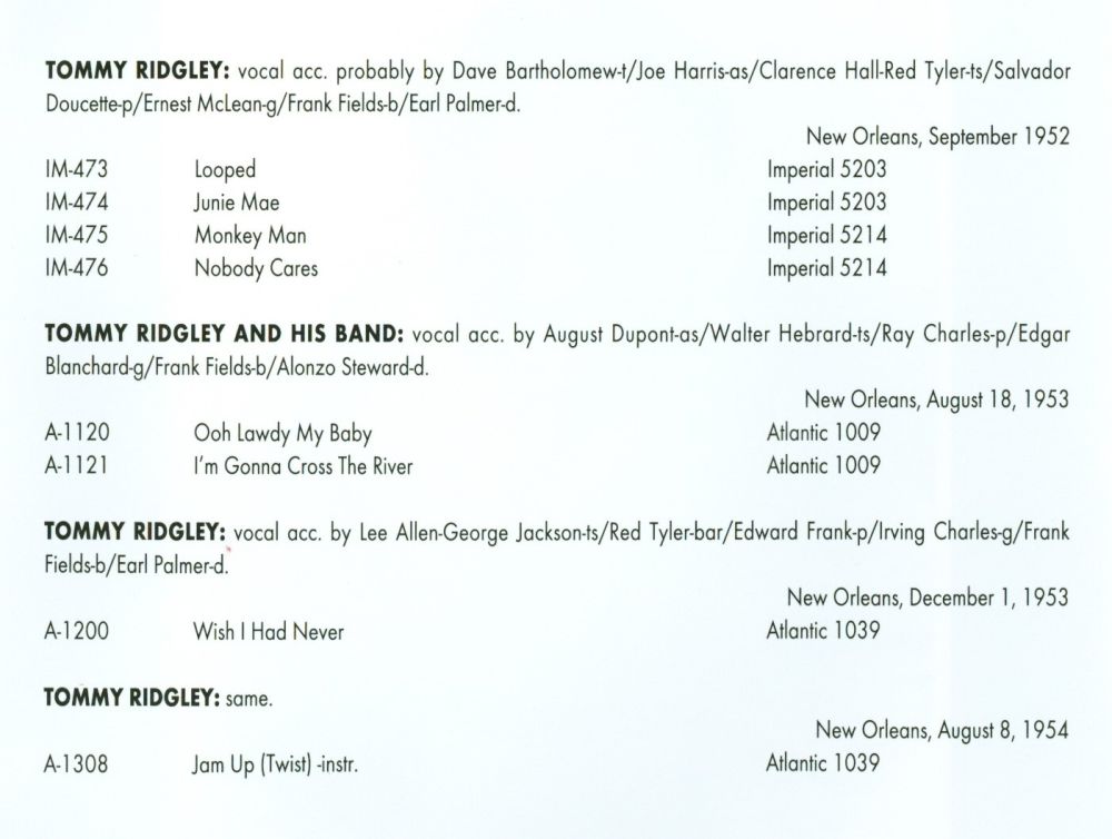 Im Laufe des Jahrzehnts trat Tommy Ridgley weiterhin regelmäßig in New Orleans und Louisiana auf und veröffentlichte weitere einmalige Soul-45er auf kleinen Labels: Blue Jay, White Cliffs und Ronn.