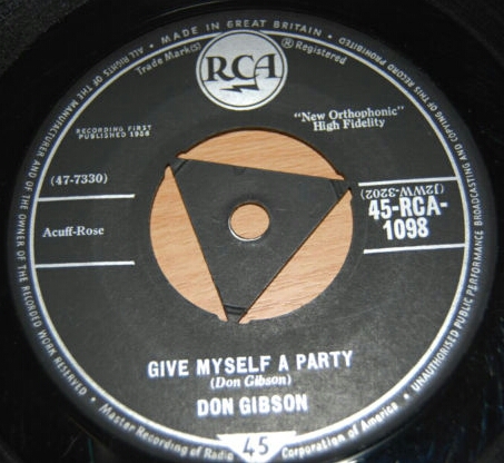 "Give Myself A Party" von Don Gibson dürfe es bei uns als Single nicht gegeben haben. Auch die spätere Version von Rosemary Clooney aus dem Jahre 1961 ist mir auf keiner deutschen Pressung bekannt