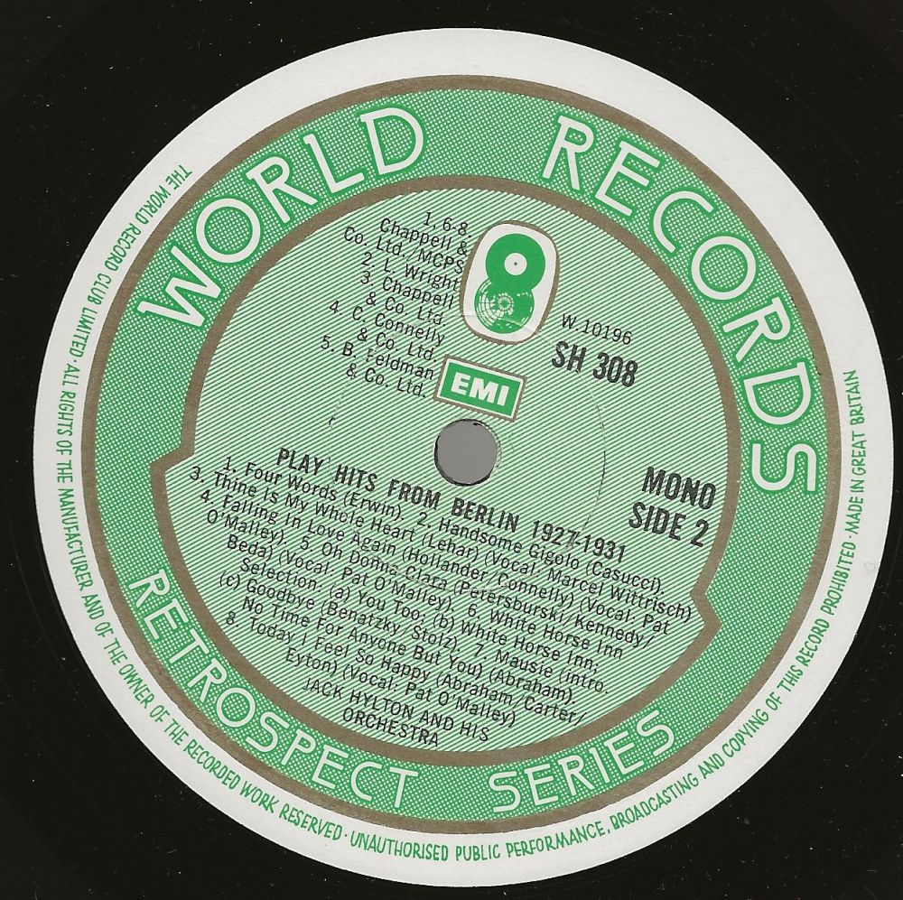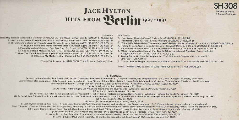 Upon Ellington's return to America, Jack Hylton and His Orchestra opened at the London Palladium. Later in the year, Hylton fell ill and was admitted to hospital for an operation, but the band carried on in his absence, with Billy Ternent in command. Another extensive tour of the continent followed, on Jack’s return to full fitness, beginning on October 17th. They played extended periods in Brussels and Antwerp before embarking on a long run at the Rex Cinema in Paris. They eventually returned to Britain on January 29th, 1934. 1933 had been a quieter year for the band, but no less successful – Jack Hylton and His Orchestra were still the biggest band attraction in Britain and all over Europe, but in 1934 there would begin a gradual distraction for Jack away from bandleading.