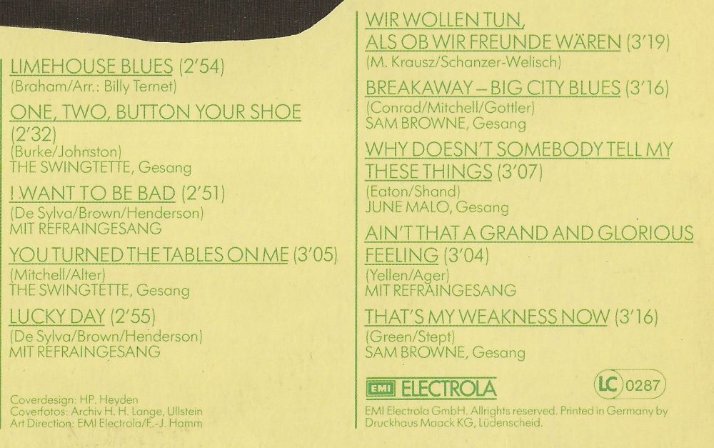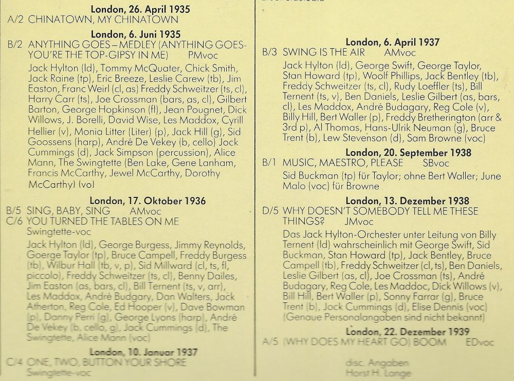 The British stage debut for The Swingtette came on August 12th, 1936 with Mrs Jack Hylton and Her Orchestra at the Paramount Theatre in London. At the same time, Jack was recording his ensemble of old and new members, using arrangements by Dutchman Melle Virsma. The session was notable as being the last to feature vocalist Pat O’Malley who, following his success in the USA with Hylton, was to pursue a career there.