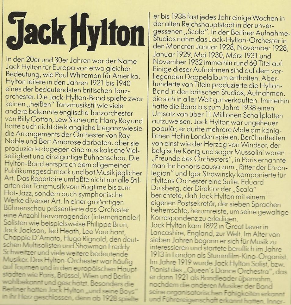 Jack Hylton certainly lived life to the full and is reported to have said many times: “Think champagne – and you’ll be champagne. Think in terms of beer and a couple of quid a week and you’ll end up with nothing”. He became one of Britain’s greatest show business successes. He said shortly before his death: “I’d have it all over again... the same lot with the same errors and the same successes.”