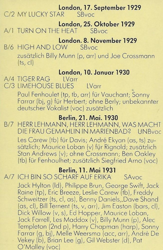 Recording sessions also took place in Czechoslovakia, for the local Polydor label, before moving on to Vienna. The tour carried on over Christmas, with a brief engagement at the Victoria Palace in London, early in January, before flying back to Europe for a broadcast in Paris on January 3rd, 1933. Paris was the venue for a three-week stay at the Rex Cinema, which included a performance in front of the President of France. The tour then moved on to Belgium before finally bringing the band home at the end of February 1933.