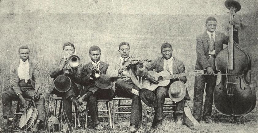 The Woodland Band, ca. 1905, Kid Orys erste Band, LaPlace/Louisiana: Edward Robinson, Kid Ory, Chif Matthews, Raymond Brown, Stonewall Matthews, Harry Forster.