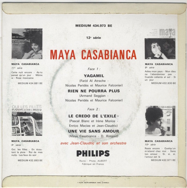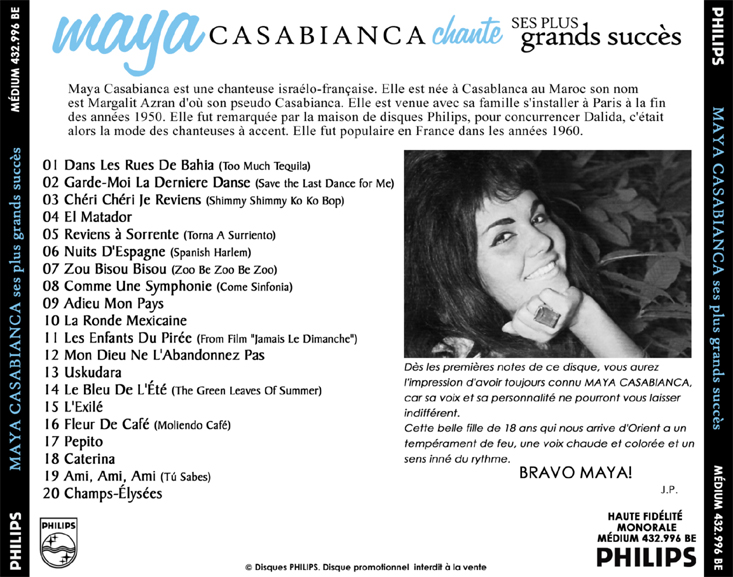 Die Sängerin Maya Casabianca wurde etwa 1941 in Casablanca, damals französisches Protektorat Marokko, als Margot Almakais Azran, kurz Margalit Azran, geboren und verstarb am 31. Dezember 2018 in Haifa, Israel. Ende der Fünfzigerjahre zog die Familie nach Paris, wo sie mit erst 13 Jahren von einem Plattenproduzenten entdeckt wurde, bei PHILIPS einen Plattenvertrag unterschreiben konnte und vorerst als Konkurenz zu Dalida eingesetzt wurde. Etwas später emigrierten ihr Onkel und ihre Tante nach Israel und sie ging mit. Sie hatte aber weiterhin neben ihren Auftritten in Nahost und im arabischen Raum, wo sie sehr populär war, auch weiterhein Auftritte in Frankreich etc. Als Bühnennamen verwendete sie, in Anlehnung an ihren Geburtsort Casablanca, Maya Casabianca.