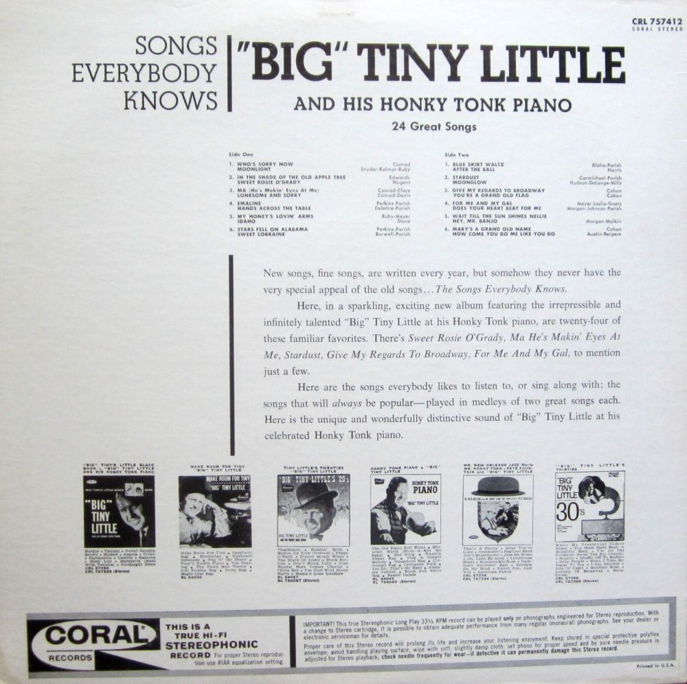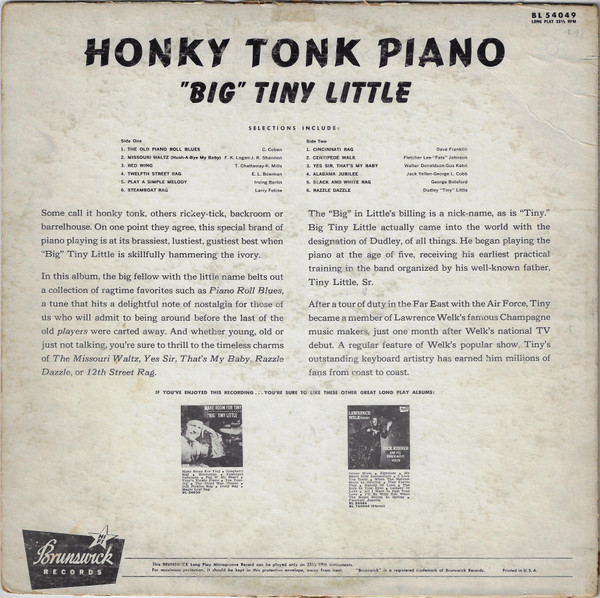 Nur einen Monat nach Welks landesweitem Fernsehdebüt 1955 wurde er Mitglied von Lawrence Welks berühmten „Champagne Music Makers“. Tiny war ein fester Bestandteil von Welks beliebter Show und seine herausragende Keyboard-Kunst hat ihm Millionen von Fans im ganzen Land eingebracht. Ein Kritiker sagte, er spiele, als würde das Klavier brennen, und ein anderer schrieb, er habe die Geschwindigkeit von Oscar Peterson, die linke Hand von Fats Waller, den Rhythmus von Errol Garner und die Fantasie von Andre Previn. Welk nannte ihn Tiny Little Jr., um ihn von seinem Vater zu unterscheiden. Später, als er sich seiner eigenen, eher beleibten Realität stellen musste, fügte Little das „Big“ hinzu und ließ das „Junior“ weg – und schuf so den großartigen Spitznamen, den er für den Rest seiner Karriere trug. Aufgrund seines Aufstiegs zu nationaler Berühmtheit während seiner vierjährigen Fernsehkarriere in der Lawrence Welk Show wurde Little als „Mr. Honky Tonk“ bezeichnet.