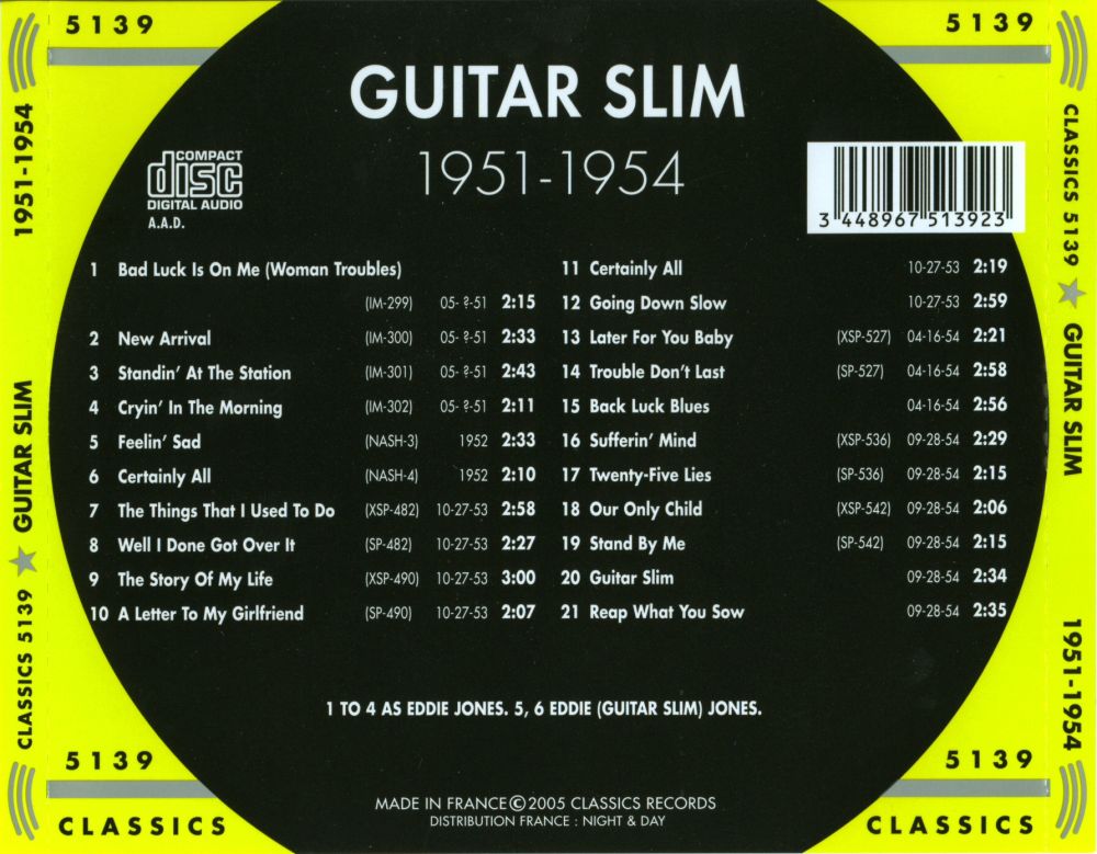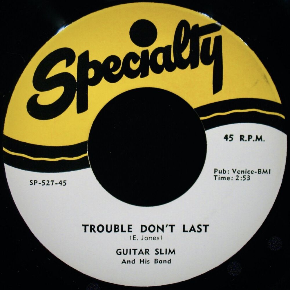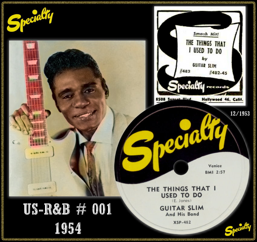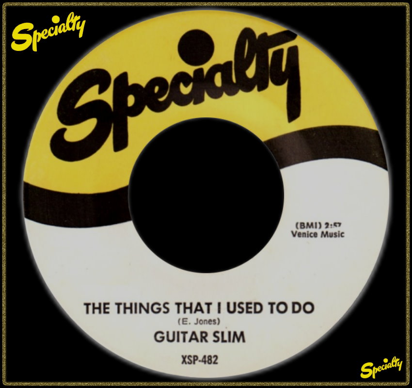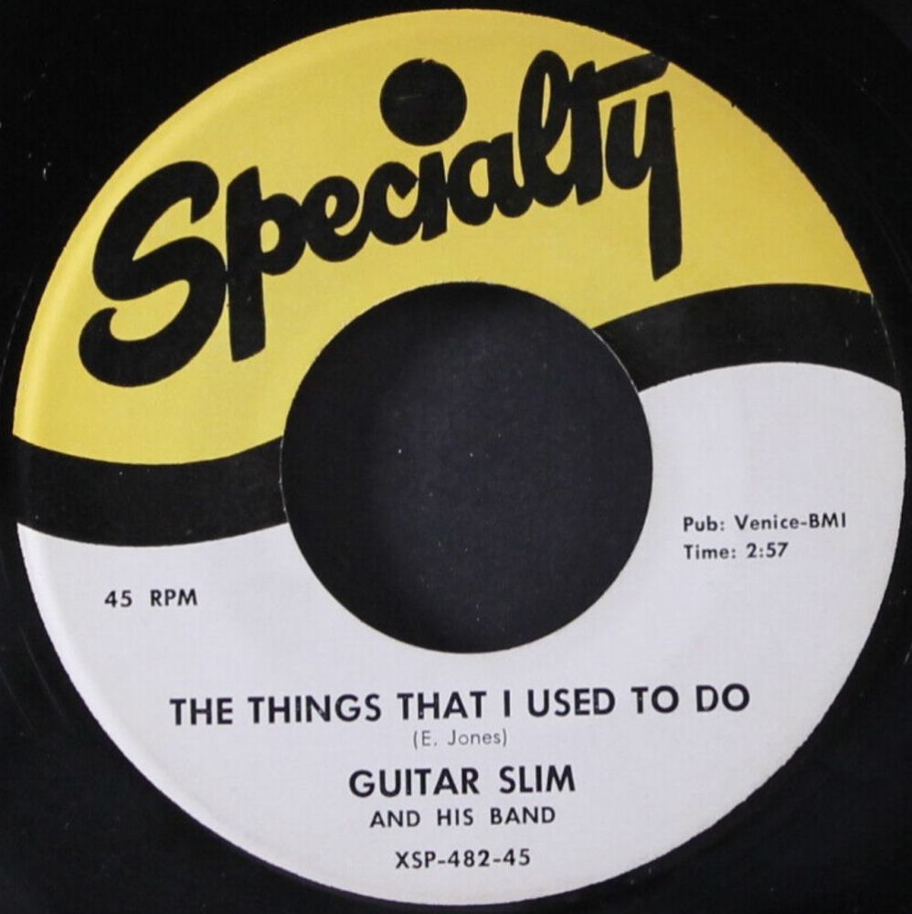 Specialty mit der Führung um Art Rupe und seinem Produzenten Johnny Vincent machten mit GUITAR SLIM das Rennen vor den großen Atlantic Records. 1954 erschien mit “The Things That I Used To Do“ auf Specialty 482-45 sofort ein # 1-Hit für 14 Wochen, bis heute ein Blues-Standard. Die Aufnahme fand in Cosimo Matassa’s Studio in New Orleans statt, und Guitar Slim wurde von Lloyd Lambert’s Band, übrigens mit Ray Charles am Piano, unterstützt. Nach Gerüchten soll Guitar Slim dieser Erfolgstitel im Traum eingefallen sein.