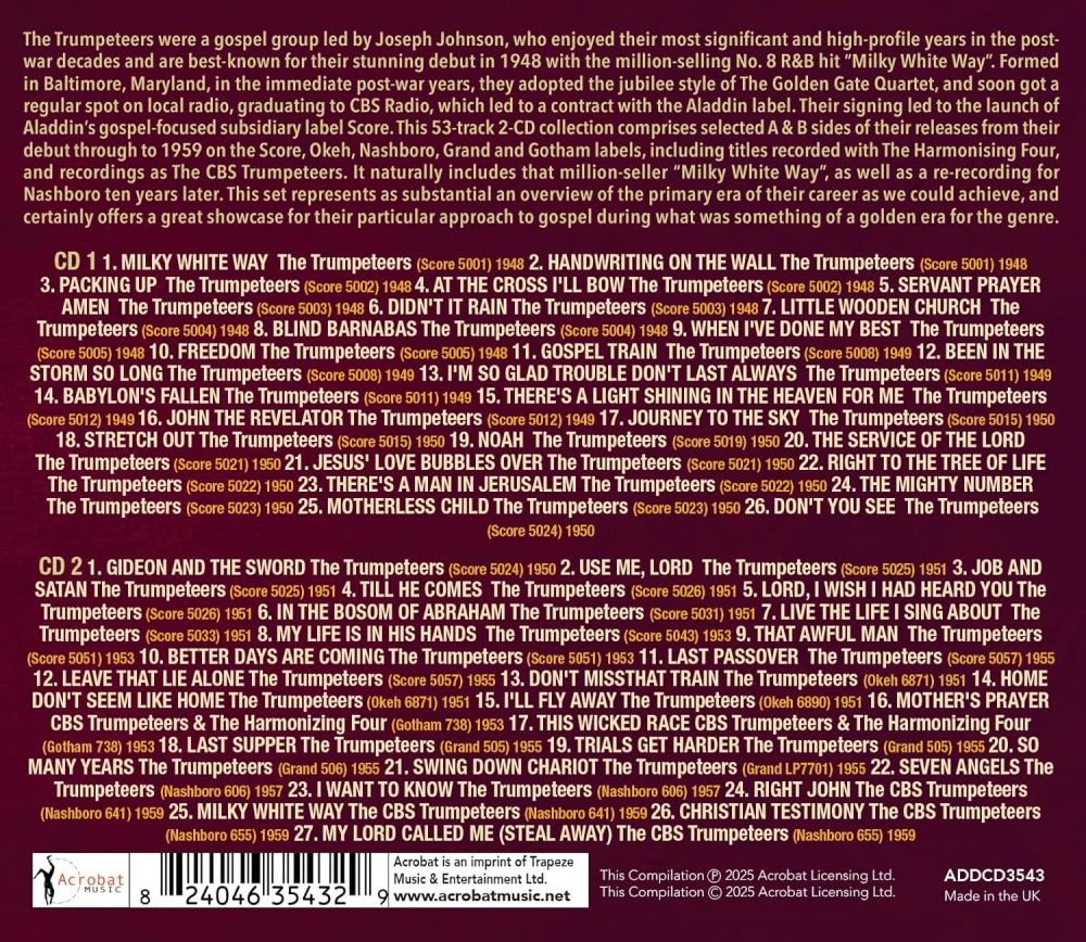 Das schwarze Gospel-Quartett The Trumpeteers, auch CBS Trumpeteers, wurden etwa 1946 in Baltimore, Maryland, von Joseph E. Johnson als Leadsänger, mit dem Tenor Raleigh Turnage, dem Bariton Willie MacNair und dem Bass James Keels gegründet. Bereits im Jahre 1947 gab es bei SCORE, einem Sub-Label von ALADDIN, ihre erste Veröffentlichung.