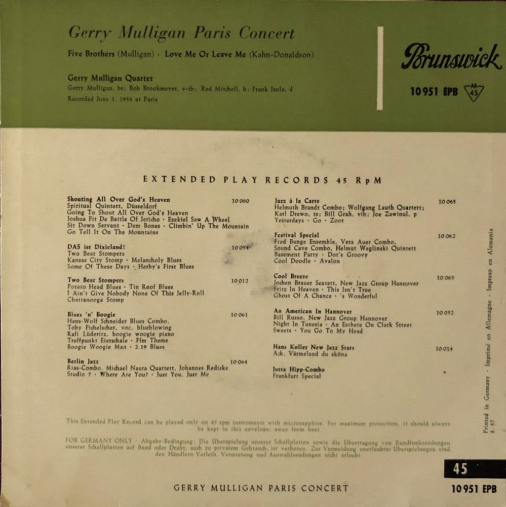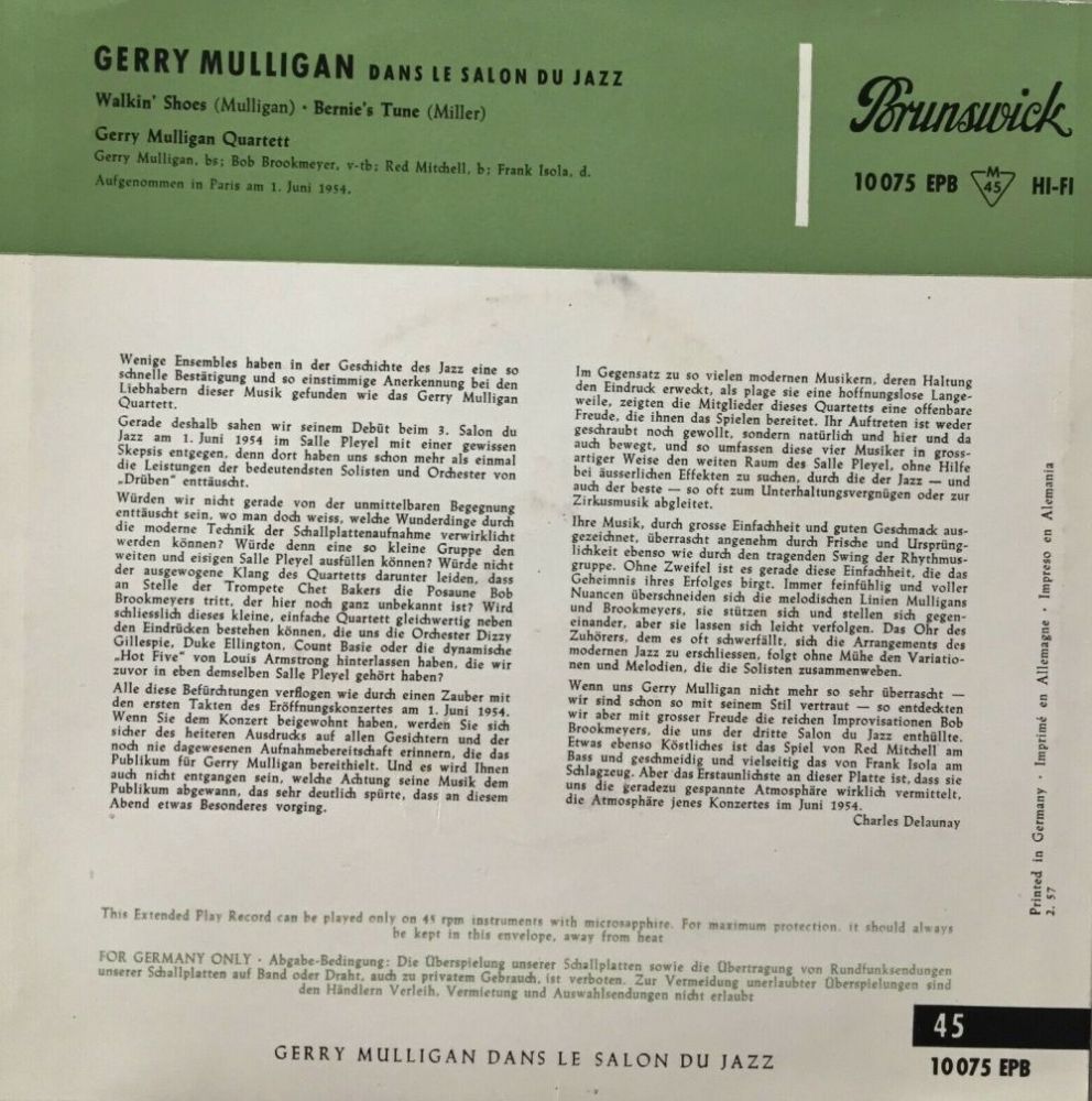 10 52....45-601....GERRY MULLIGAN QUARTET Gerry Mulligan, Baritone sax; Chet Baker, Trumpet; Chico Hamilton, Drums Bob Whitlock, Bass..Bernie's Tune (PJ 230)/Lullaby Of The Leaves (PJ 231)