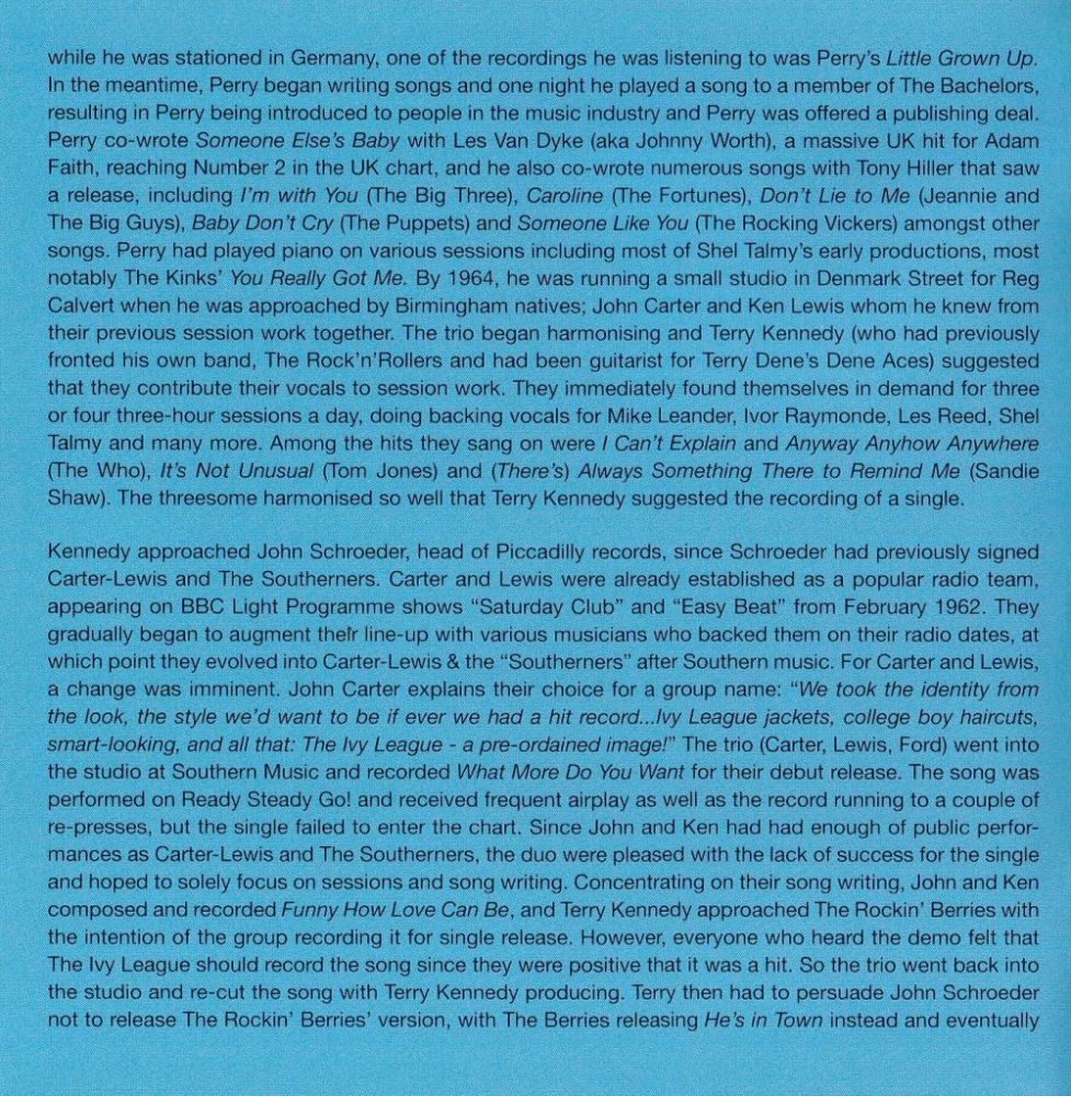 Die Ivy League war keine gewöhnliche Popgruppe. Jedes Mitglied brachte ein einzigartiges Talent mit, und wie der erfahrene Perry Ford verfügte jeder über einen reichen Erfahrungsschatz. Perry Ford war seit Mitte der 1950 er Jahre in der Musikszene der Denmark Street aktiv. Nach seiner Demobilisierung kam er von Lincoln nach London, um die London School of Music zu besuchen. Allerdings nahm er nur an einer einzigen Unterrichtsstunde teil, da diese 14 Schilling kostete und er sich keine weiteren leisten konnte. Stattdessen hielt er sich in der Tin Pan Alley auf und knüpfte Kontakte zu den vielen Musikern der Denmark Street. Er war außerdem ein talentierter Pianist, insbesondere im Barrelhouse und Boogie-Woogie, und begann, in Cafés und Clubs in Soho zu singen, während er Jazz und Rock’n’Roll spielte.