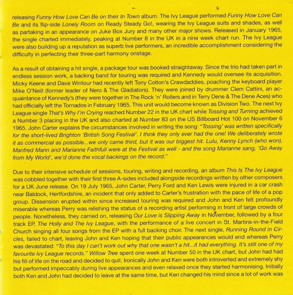 Die nächste Single von Ivy League, “That's Why I'm Crying“, erreichte # 22 der britischen Charts, während “Tossing and Turning“ # 3 in Großbritannien und am 06. November 1965 auch # 83 der US Billboard Hot 100 erreichte. John Carter erklärt die Umstände der Entstehung des Songs: „“Tossing“ wurde speziell für das kurzlebige Brighton ‚British Song Festival‘ geschrieben. Ich glaube, es gab nur dieses eine Festival! Wir haben es bewusst so kommerziell wie möglich gestaltet … wir wurden zwar nur Dritter, aber es war unser größter Hit. Lulu, Kenny Lynch (der Gewinner), Manfred Mann und Marianne Faithfull waren auch beim Festival – und für das Lied, das Marianne sang, “Go Away from My World“, hatten wir die Backing Vocals auf der Platte eingesungen.“