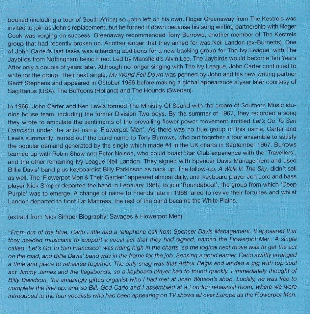 Die Flowerpot Men & Their Garden traten fast täglich auf, bis Keyboarder Jon Lord und Bassist Nick Simper die Band im Februar 1968 verließen, um sich Roundabout anzuschließen, der Gruppe, aus der später Deep Purple hervorgehen sollte. Eine Namensänderung in Friends Ende 1968 brachte den erhofften Erfolg nicht, und während Landon die Band verließ, um Fat Mattress zu gründen, formierte sich der Rest der Band zu den White Plains. (Auszug aus Nick Simpers Biografie: “Savages & Flowerpot Men“) „Völlig unerwartet erhielt Carlo Little einen Anruf von Spencer Davis Management. Sie suchten Musiker zur Unterstützung einer von ihnen unter Vertrag genommenen Gesangsgruppe namens Flowerpot Men. Die Single “Let’s Go To San Francisco“ stürmte die Charts, also lag es nahe, die Gruppe auf Tournee zu schicken. Billie Davis’ Band war im Gespräch. Carlo witterte gute Verdienstmöglichkeiten und vereinbarte kurzerhand einen Probentermin. Das einzige Problem: Arthur Regis hatte einen Auftritt mit dem Soul-Star Jimmy James and the Vagabonds ergattert, weshalb schnell ein Keyboarder gefunden werden musste. Mir fiel sofort Billy Davidson ein, der unglaublich begabte Organist, den ich in Joan Watsons Laden kennengelernt hatte. Zum Glück hatte er Zeit, die Band zu vervollständigen, und so trafen Bill, Ged, Carlo und ich uns in einem Londoner Proberaum, wo wir den vier Sängern vorgestellt wurden, die bereits in ganz Europa als die Flowerpot Men aufgetreten waren.“