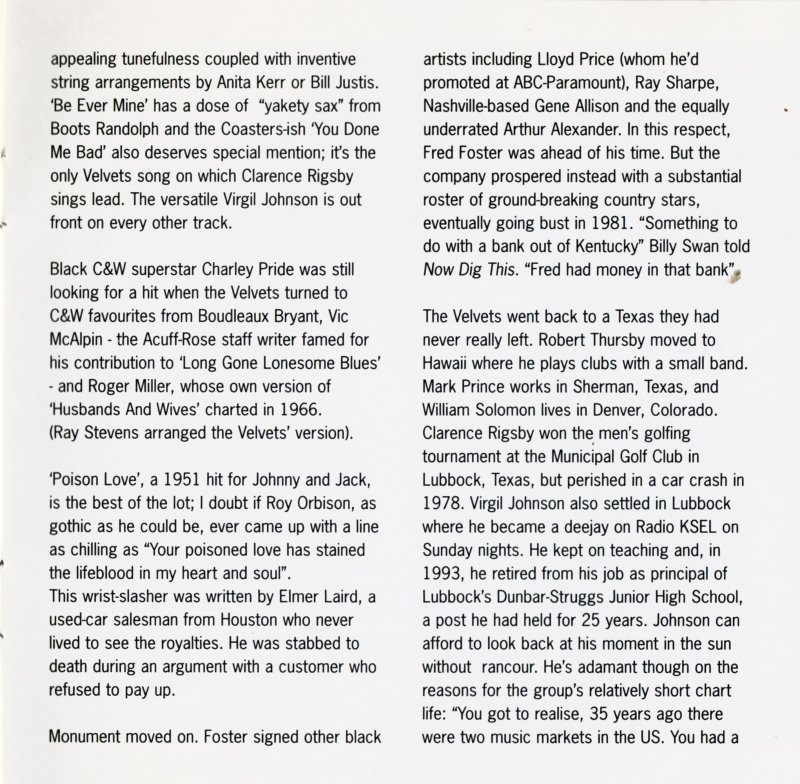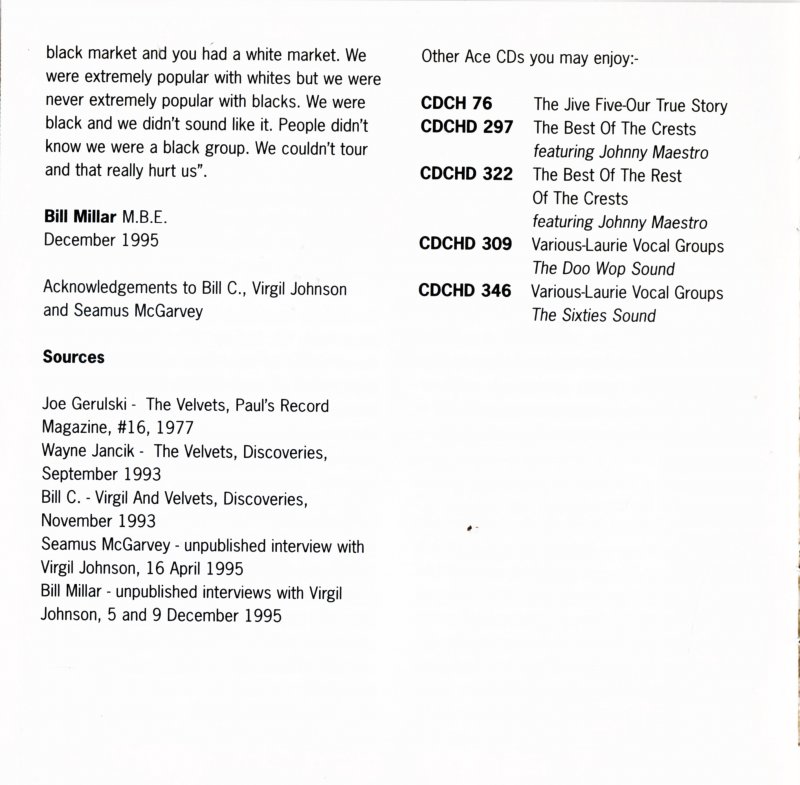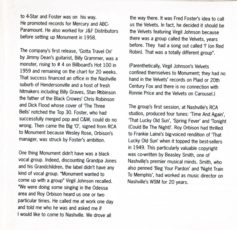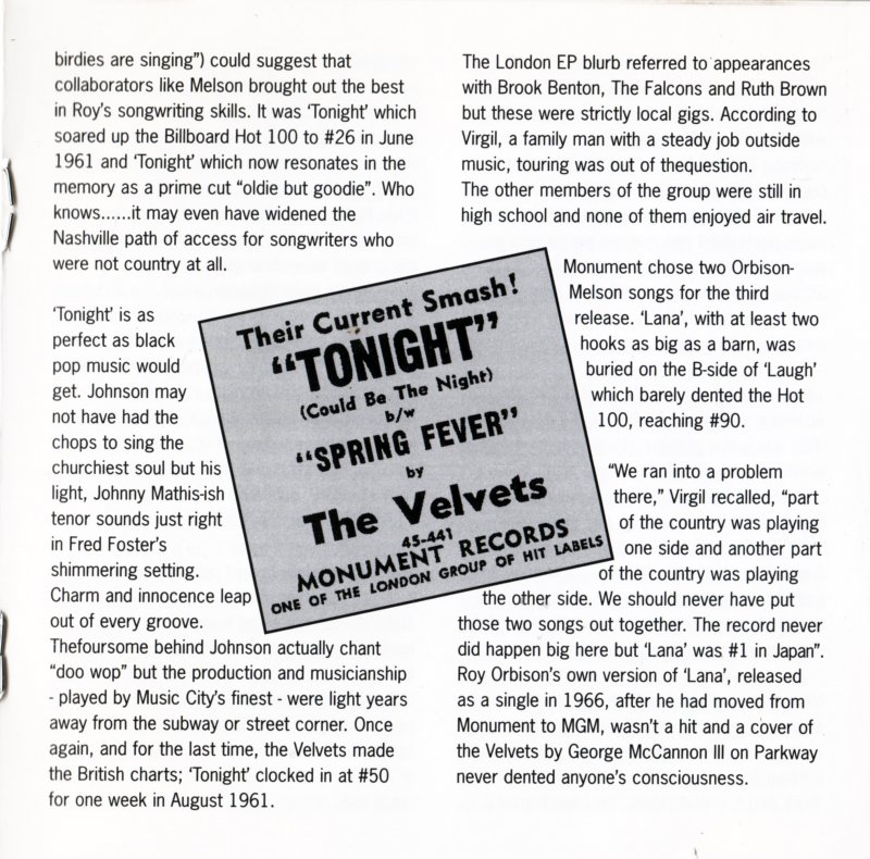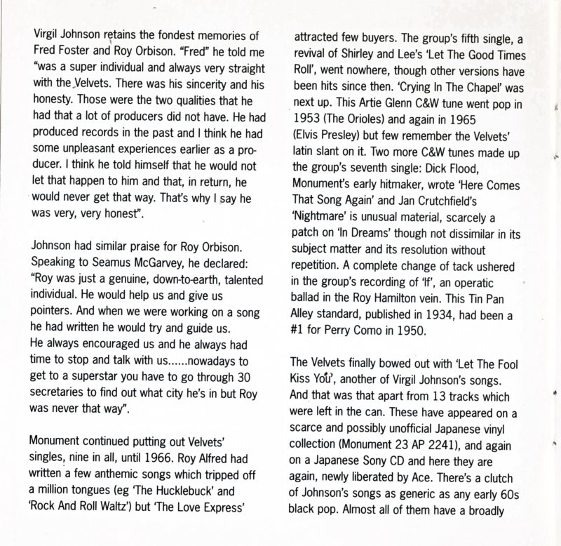 Diese Velvets waren ein Fantasie-Produkt, welches aus einem Instrumental ohne Namen entstand. Als sie nach 14 Monaten einen Namen bekamen, wurden sie auch gleich als Begleitformation benutzt. Vergleiche Matrix-Nummern.