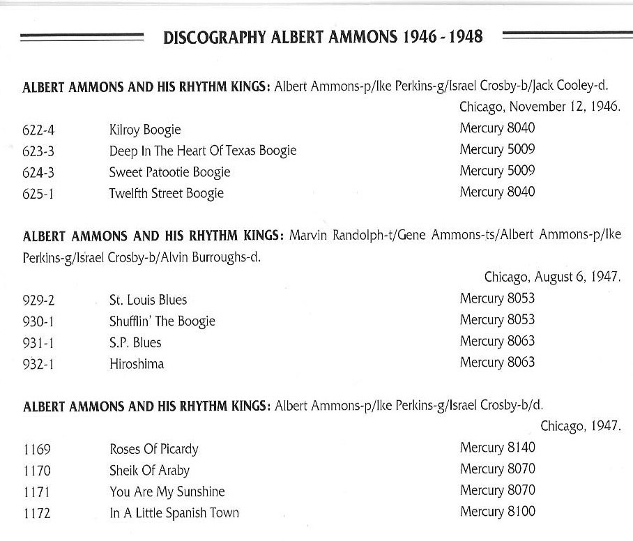 So oder so starb er am 02. Dezember eines angeblich natürlichen Todes (auch hier ist es offiziell schwer zu bestimmen) im Alter von 42 Jahren. Ammons, zutiefst betrauert von seinen Kollegen und Freunden, wurde auf dem Lincoln Cemetery in Worth Township vor den Toren Chicagos beerdigt. Aus der Sterbeurkunde von Cook County geht hervor, dass er möglicherweise noch mit Hattie verheiratet war, aber auch das ist nur ein vager Hinweis. Er ist noch heute für seinen aggressiven Spielstil und seine tiefen Basslinien bekannt und praktisch alle seine Aufnahmen sind in digitalen Formaten erhältlich, ebenso wie seine begehrten 78-rpm-Platten.