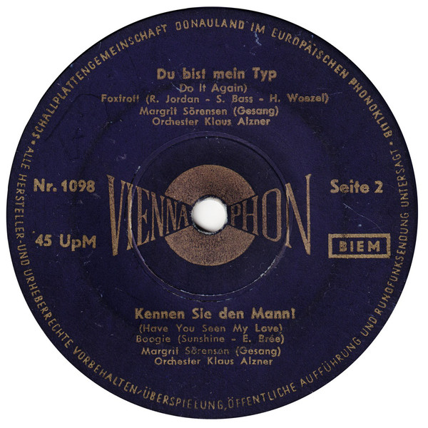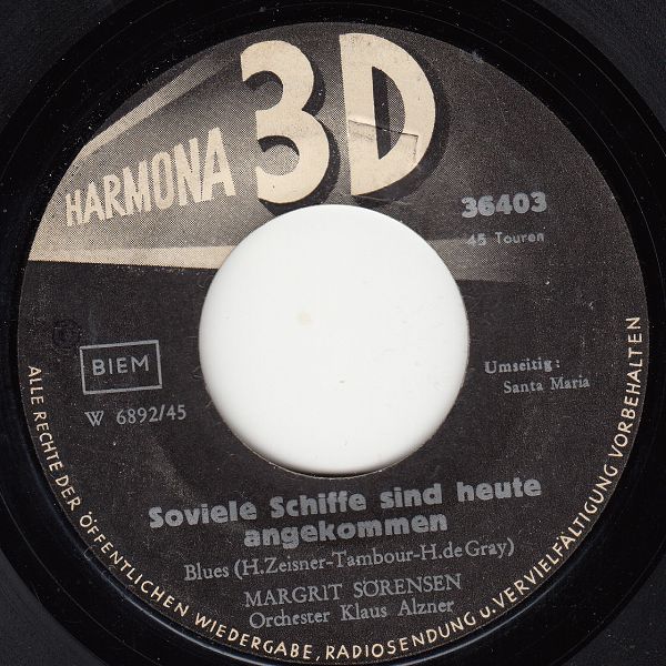 Du warst mit "Ich werd mich an den Jonny schon gewöhnen" schon sehr nahe dran, denn dieser Titel stammt ebenfalls von Hans Zeisner. Was aber die Verbindung Klaus Alzner, Hans Zeisner und Margrit Sörensen noch verstärkt ist der Umstand, dass das deutschsprachige Original von "Bremerhaven" "So viele Schiffe sind heut' angekommen" heißt und von Margrit Sörensen auf HARMONA 3D, mit der Begleitung von Klaus Alzner, interpretiert wurde. Jene Margrit Sörensen die wiederum den englischsprachigen Titel "Have You Seen My Love" als "Kennen sie den Mann?", ebenfalls mit Klaus Alzner als Begleitorchester auf deutsch bringt, ebenfalls auf HARMONA 3D. Bei VIENNAPHON handelt es sich lediglich um eine Club-Pressung für "Donauland"-Mitglieder.