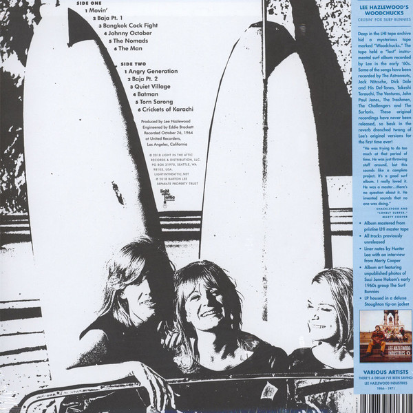 Light in the Attic Records ist stolz darauf, seine Lee Hazlewood Archivreihe mit dieser ganz besonderen Veröffentlichung fortzusetzen. Keine Neuauflage, sondern eine brandneue, noch nie veröffentlichte Zeitkapsel aus der Surf-Ära. Lee Hazlewoods Woodchucks Crusin’ for Surf Bunnies ist der perfekte Soundtrack für sonnengebräunte Haut und salzige Wellen, Hot Rods und Sommerliebe. Es ist der Soundtrack zum amerikanischen Traum der frühen 1960er Jahre und kommt aus Kalifornien. Obwohl Lee und Suzi Jane Hokom sich noch nicht kennengelernt hatten, lebten sie beide diesen Traum…Suzi mit ihrer Gruppe The Surf Bunnies und Lee über seine kurze Surfmusik, die mit Alben wie Al Caseys Surfin' Hootenanny, Hal Blaine and the Young Cougars und Die Gletscher Vom Meer zum Ski.